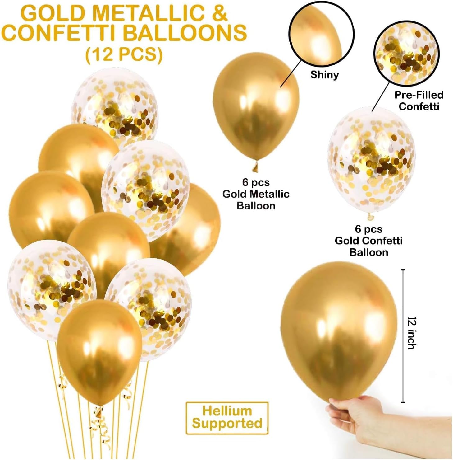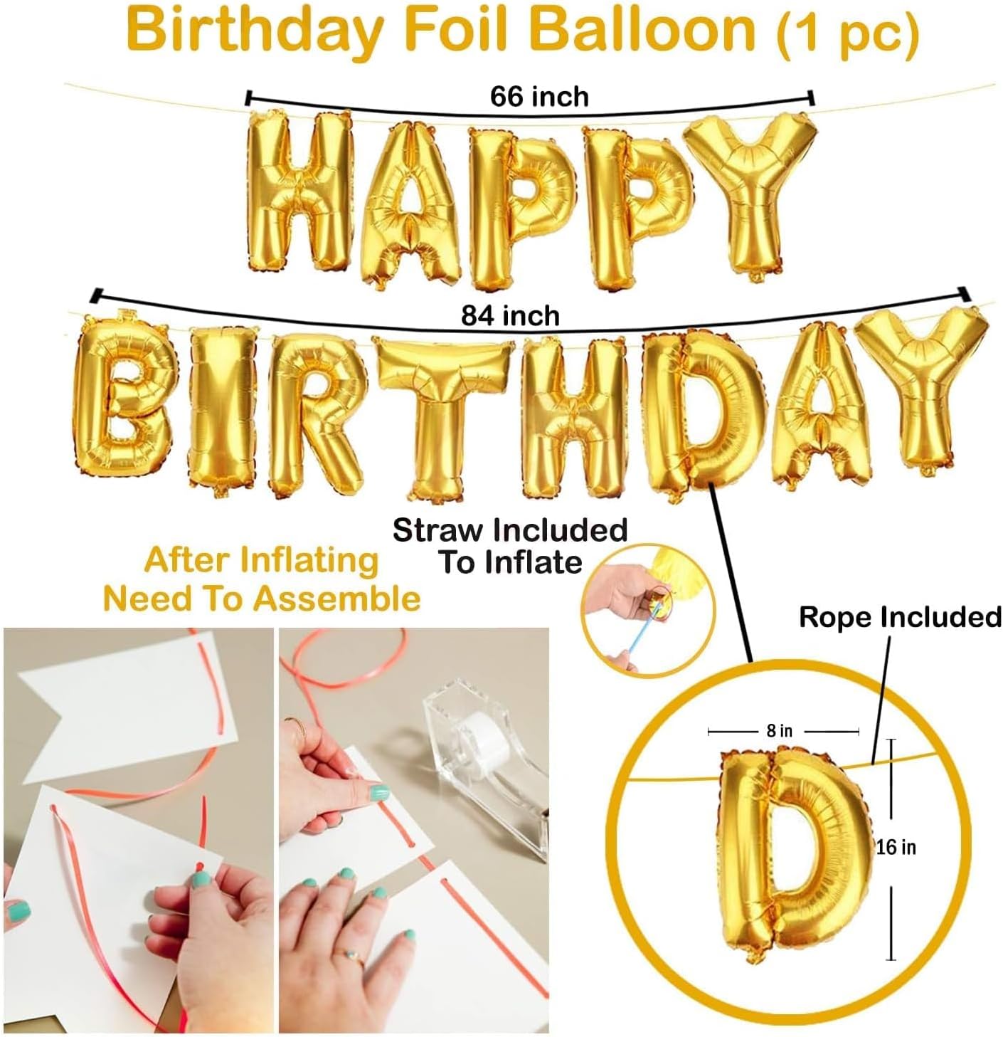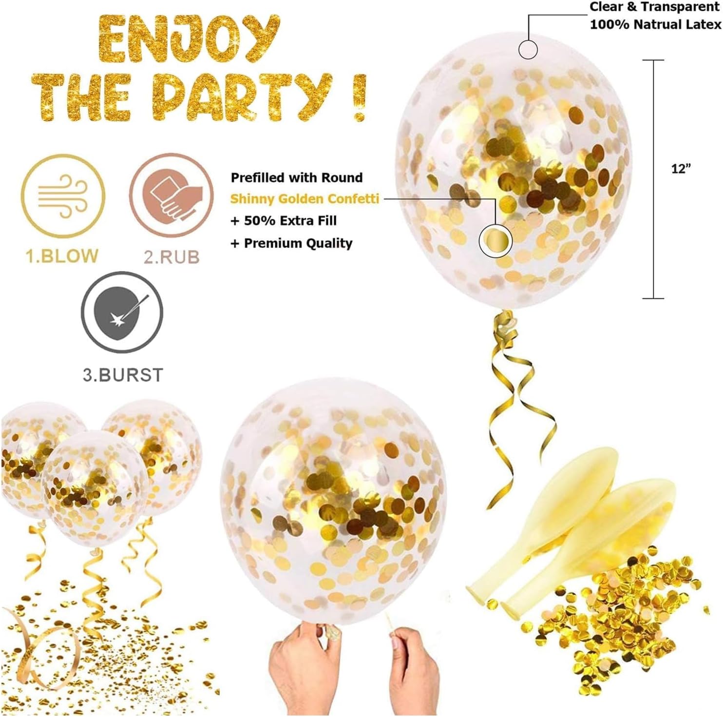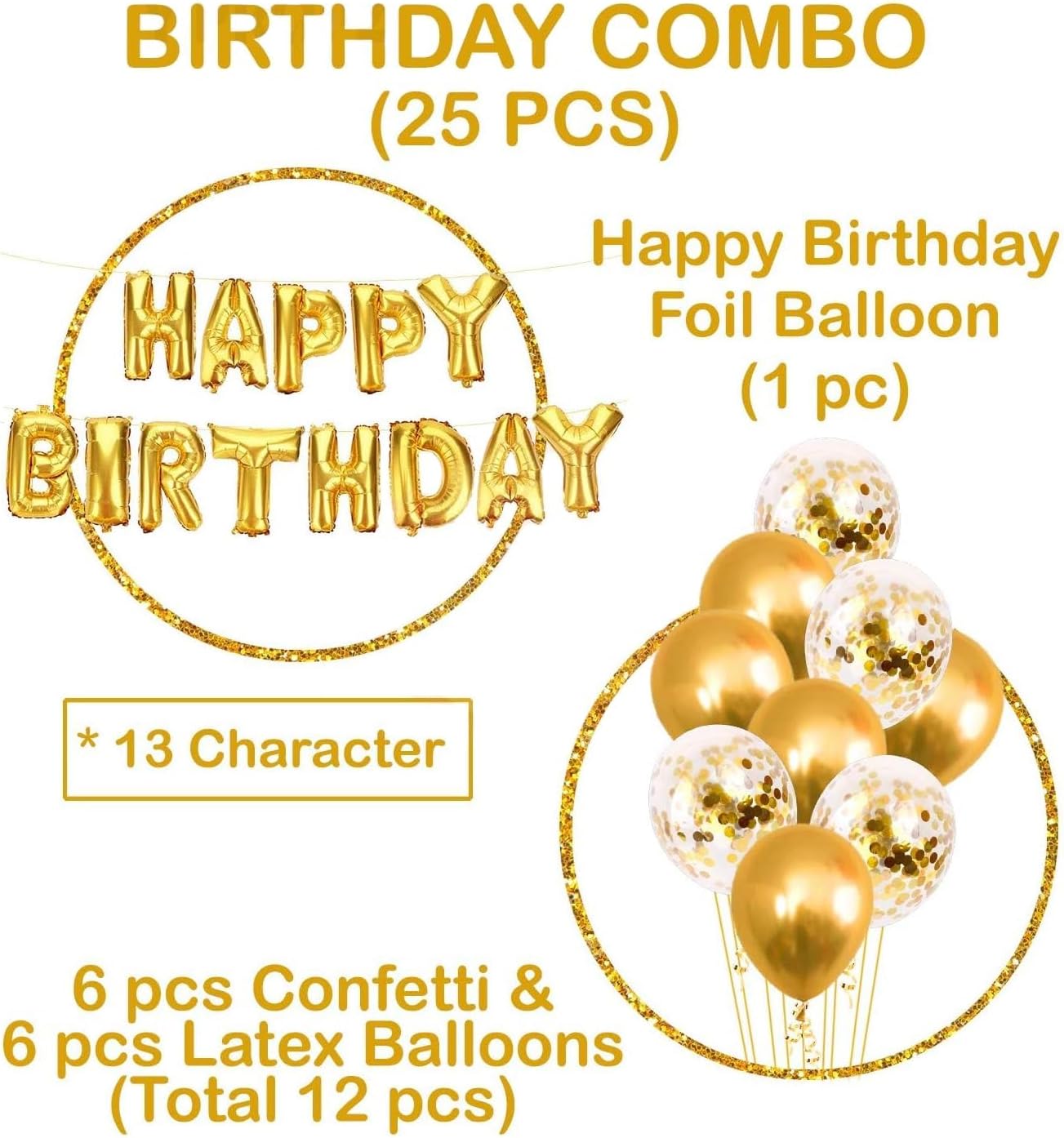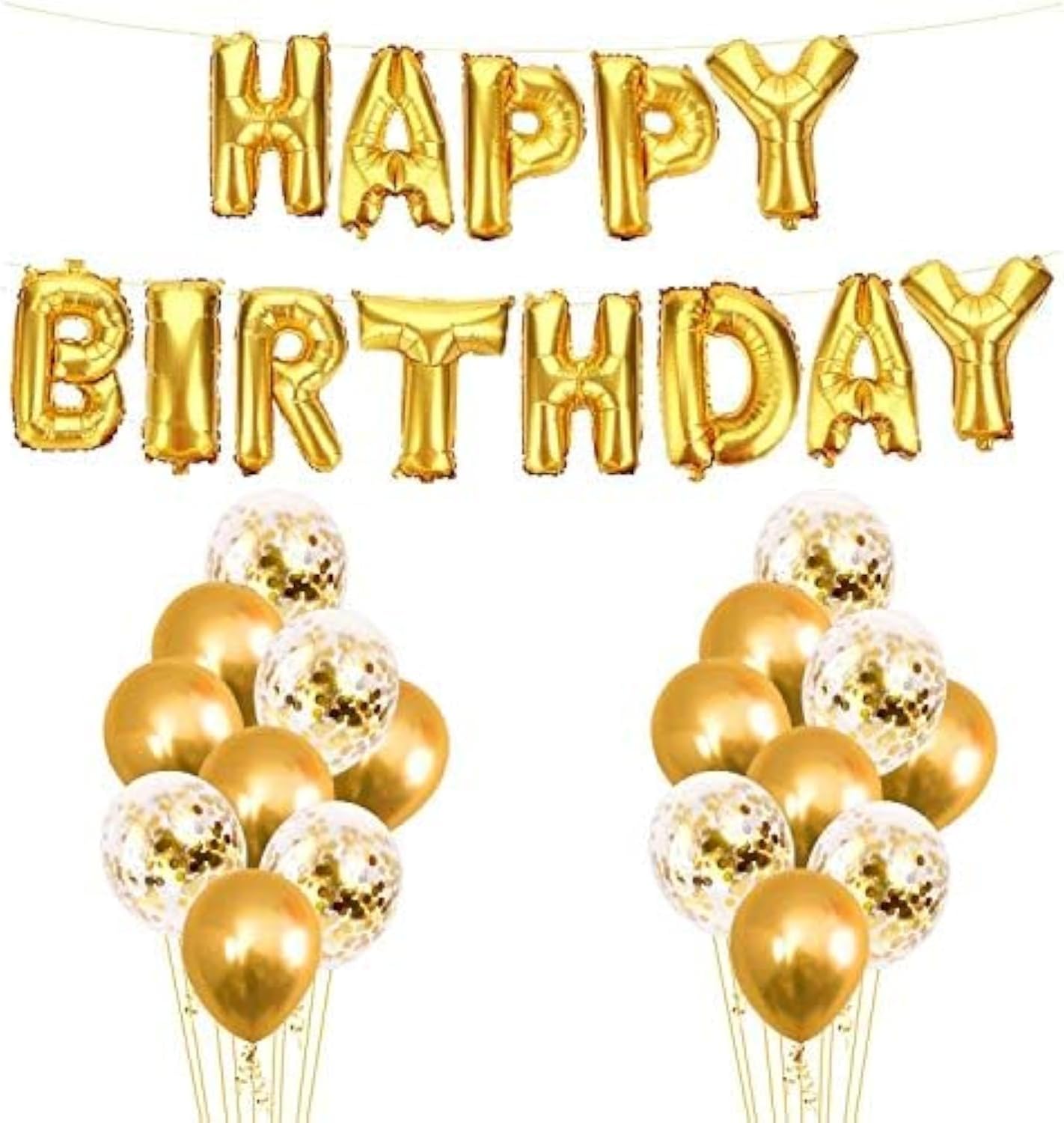 - COMPLETE BIRTHDAY BALLOONS SET: Includes 13 self-sealing letter balloons (16” each) to create a stunning Happy Birthday Banner, 12 vibrant gold latex and confetti balloons, and a ribbon for effortless assembly.