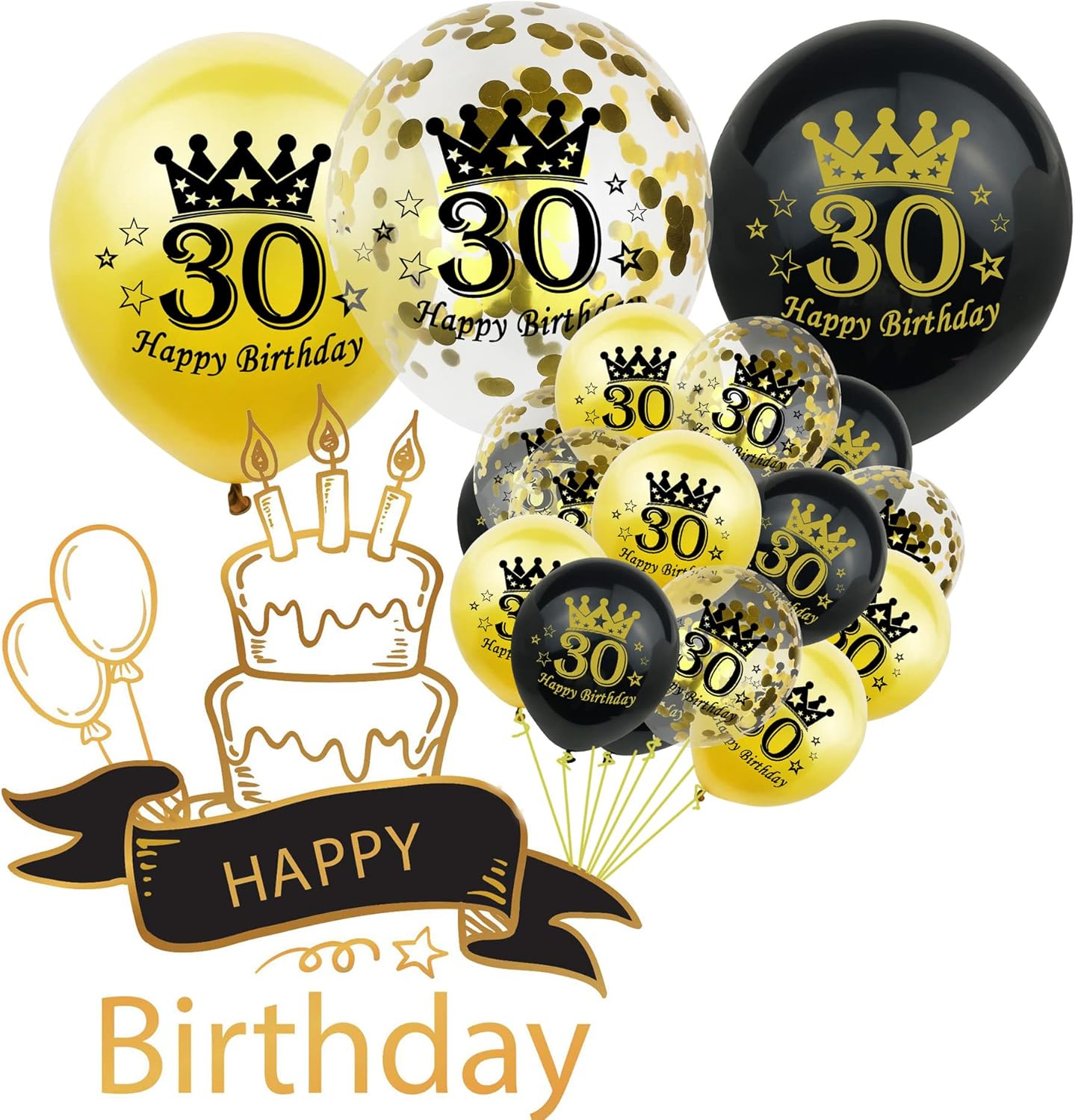 - 30th BIRTHDAY BALLOONS SET: Includes 15 latex balloons – 5 x Golden Balloons with "30 Happy Birthday" print, 5 x Gold Confetti Balloons with "30 Happy Birthday" print, 5 x Black Balloons with "30 Happy Birthday" print for 30th Birthday Balloon decoration. The black and gold birthday balloons will definitely make your 30th birthday party more unique, impressive, and memorable.