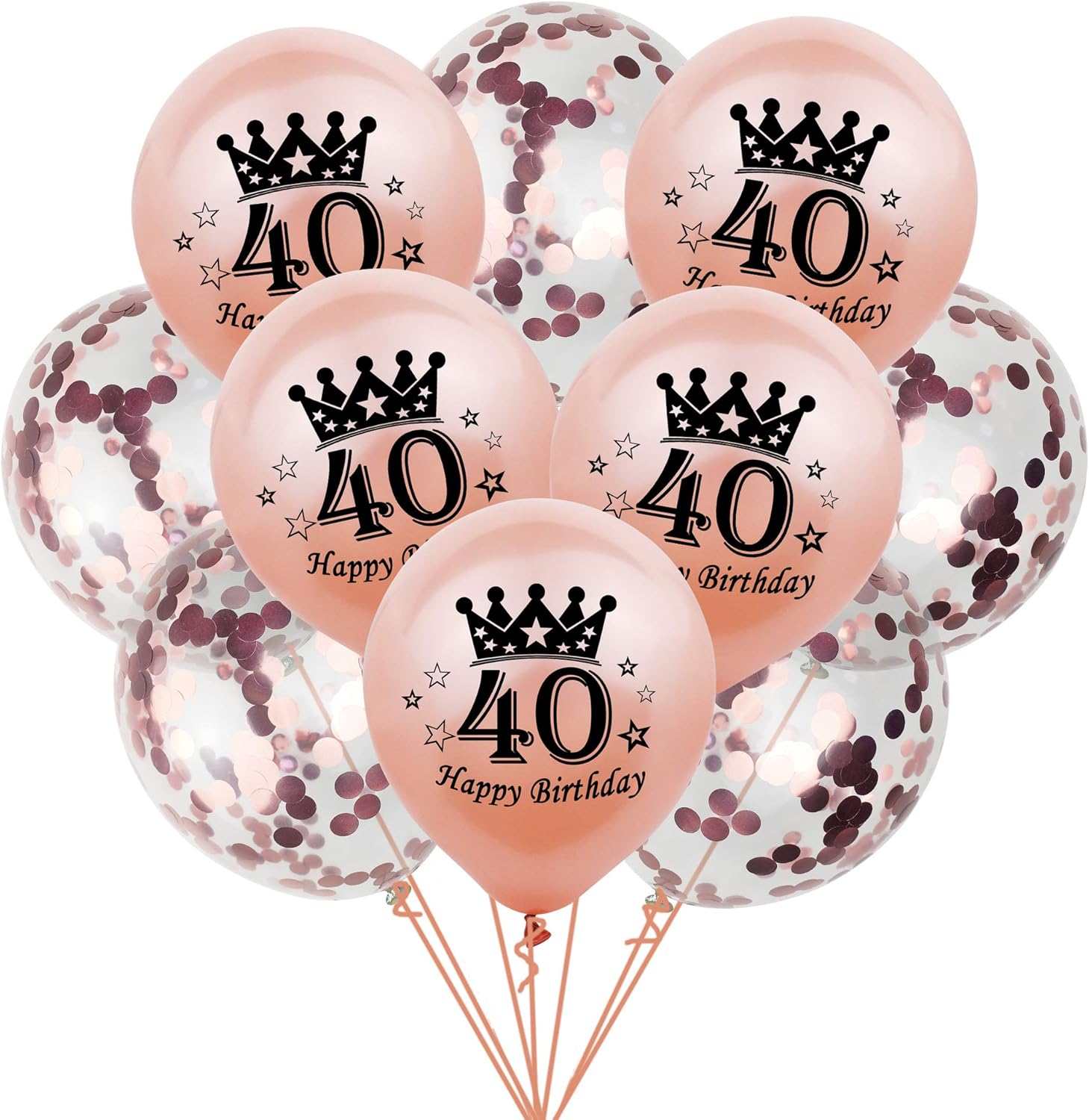 - 40th BIRTHDAY BALLOONS SET: Includes 10 latex balloons – 5 rose gold "40 Happy Birthday" print and 5 clear confetti balloons with rose gold confetti.