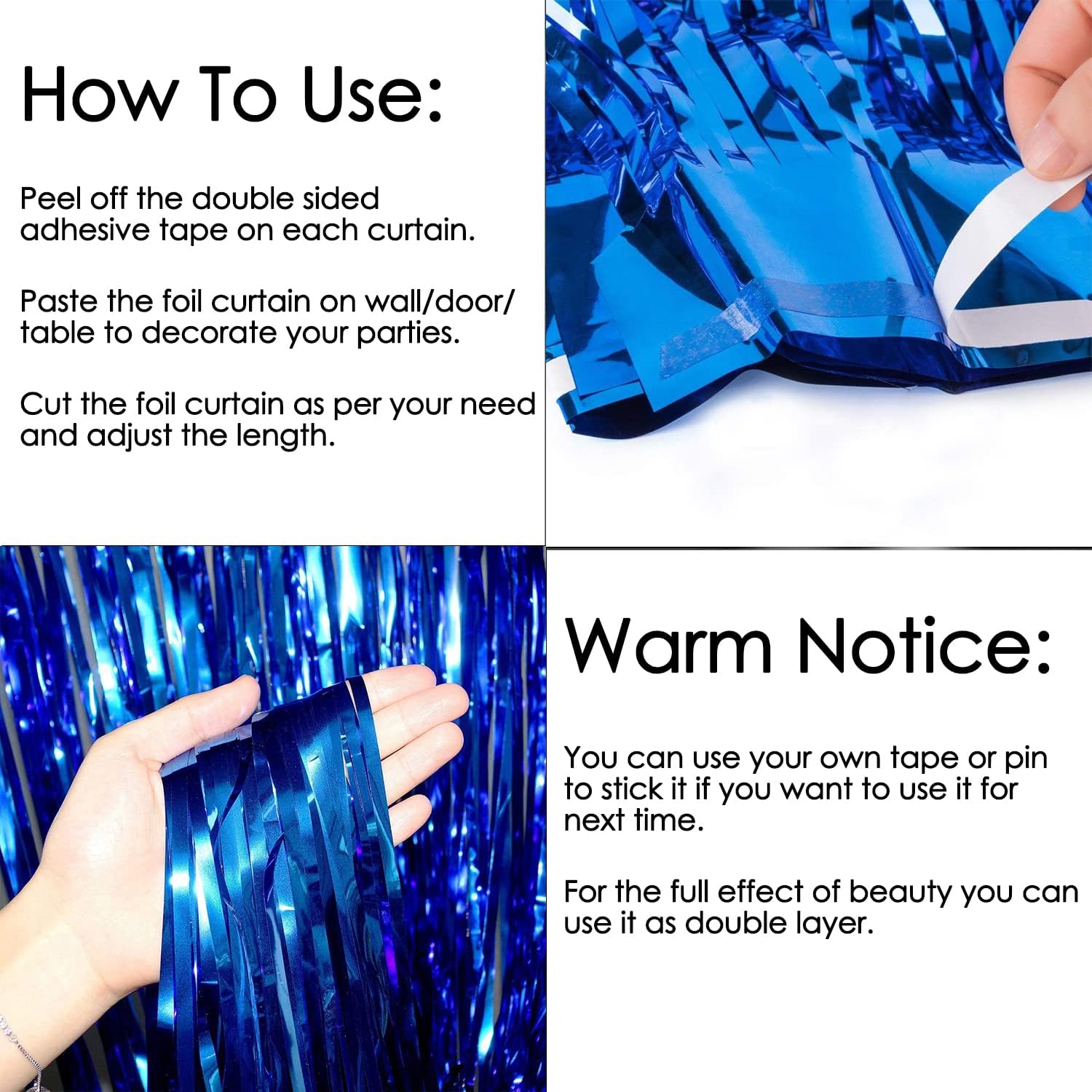 - EASY INSTALLATION: The foil curtain features an adhesive strip on top for easy installation on walls or doors, and can be hung separately or layered for a fuller look, making it perfect for creating a photo booth or party backdrop.