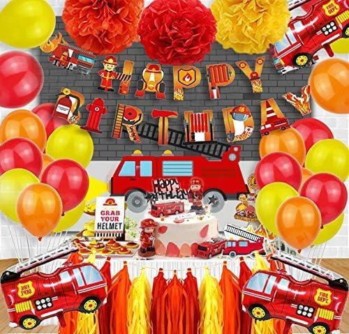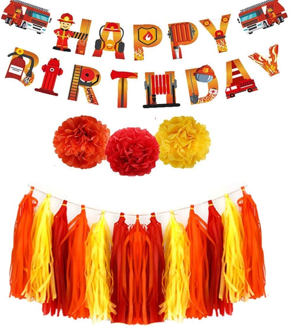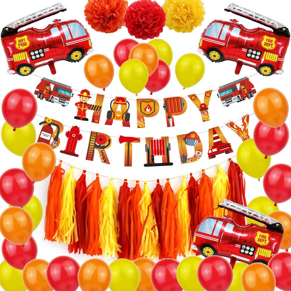 - WHAT WILL YOU GET: 1 x Happy Birthday Banner, 3 x Fire Truck Mylar Foil Balloons, 15 x tassel banner (red, orange, and yellow), 33 x Latex Balloons (Red, Orange, Yellow), 3 x Pom Pom (Red, Orange, Yellow)