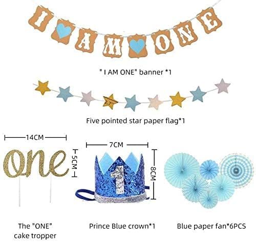 - WHAT WILL YOU GET: 1 x Birthday Crown Hat, 1 x "One" Cake Topper, 1 x “I am One” banner, 1 x Star Bunting Banner, 6 x Blue Paper Fan