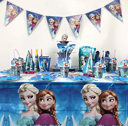 - FROZEN TABLEWARE: Includes 10 x Paper cups, 10 x Paper Plates, 10 x Knives, 10 x Forks, 10 x Spoons, 10 x Straws, 10 x Toothpick, 20 x Tissues, 6 x Popcorn box, 6 x Paper Hats, 6 x Blow Dragon, 6 x Horns, 1 x Triangular flag banner, 1 x tablecloth, 10 x Return gift bags, 10 x Invitation pieces.