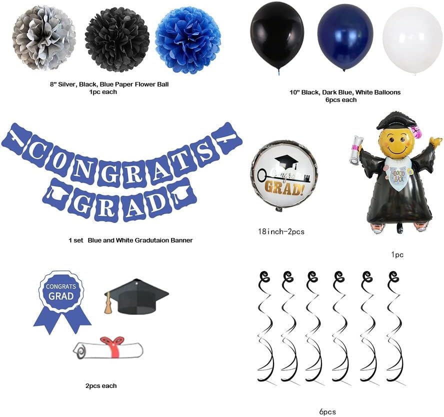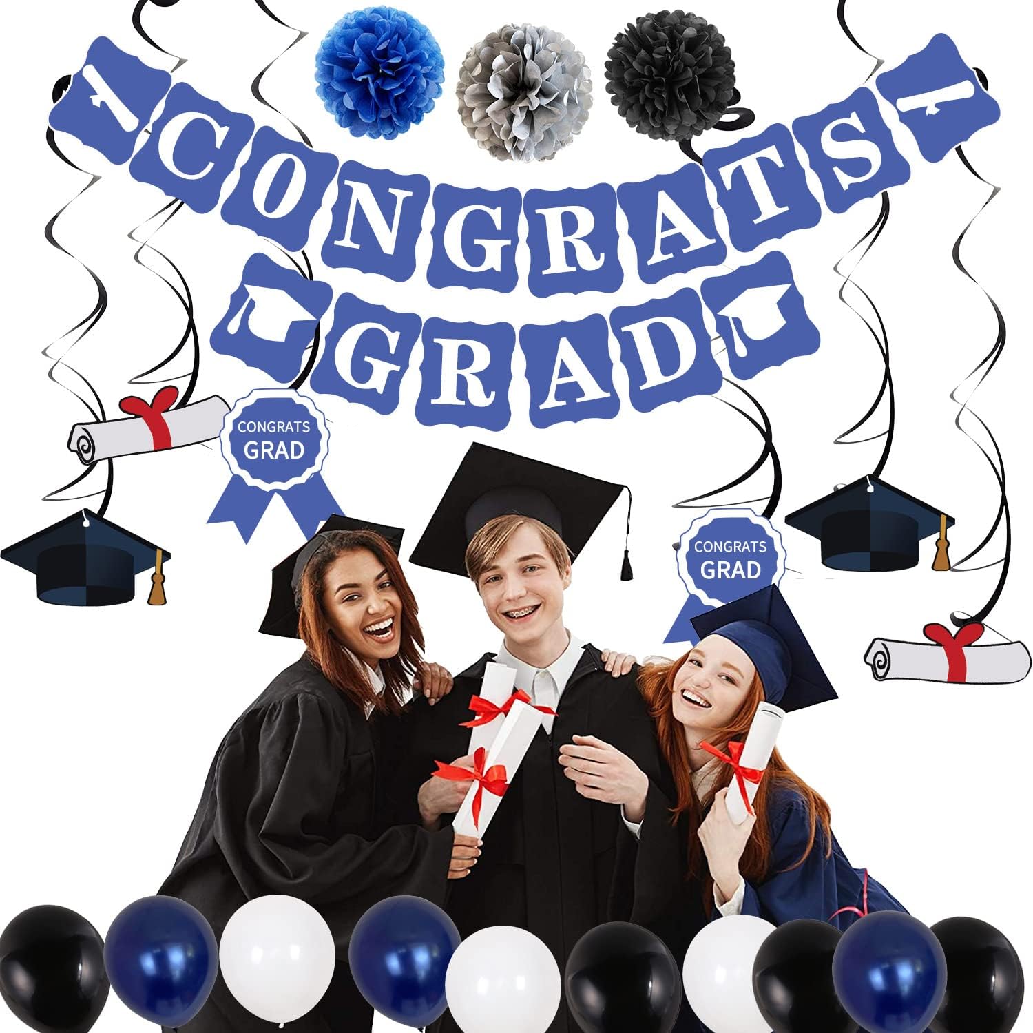 - GRADUATION DECORATIONS 2025: Set of 37 pcs for graduation party comprising of CONGRATS GRAD banner, Graduation Balloons, swirls & graduation props and paper flowers for the class of 2025.