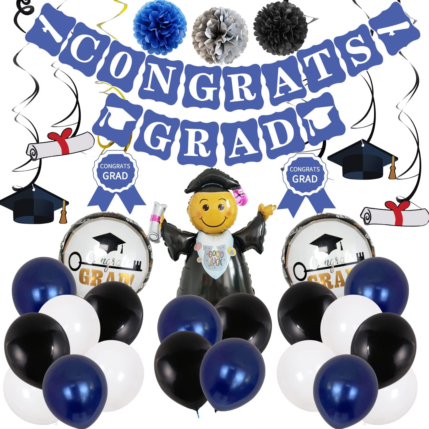 Brain Giggles Graduation Decorations Set of 37 pcs with Congrats Grad Banner, Balloons, Balloons, Hanging Swirls and Photo Booth Props for Graduation Party | Blue Balloons for a Grad