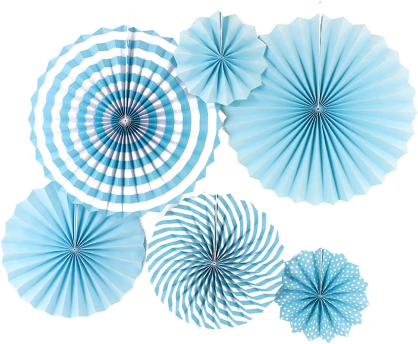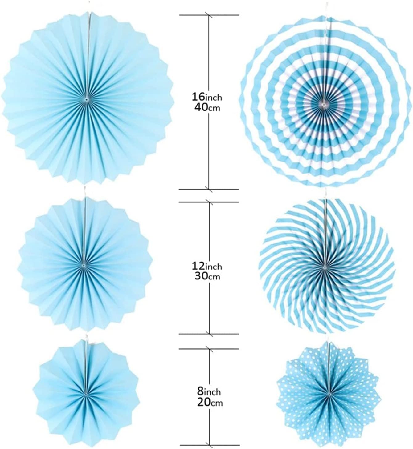 - PAPER FAN SET: Includes 6 blue paper fans in three sizes – 2x 16-inch, 2x 12-inch, and 2x 8-inch, with polka dots, stripes, and solid patterns.
