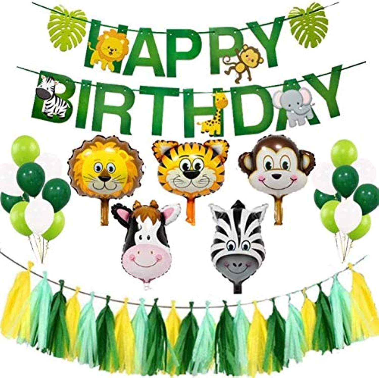- WHAT WILL YOU GET: 5 x 22 inch Animal Face Foil balloons, 4 x Palm Tree Leaf, 15 x Latex balloons (green, pale green and white), 15 x Latex balloons, 1 x "HAPPY BIRTHDAY" letters banner, 5 x Confetti Balloons