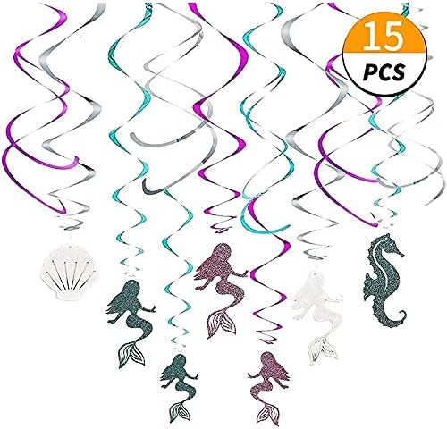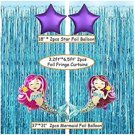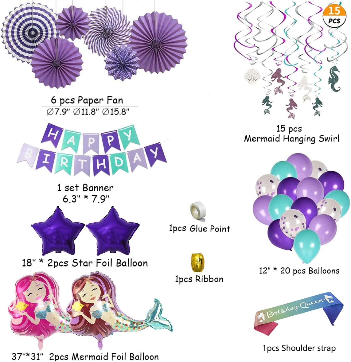 - WHAT WILL YOU GET: 1 x (6.3*7.9-inch) "HAPPY BIRTHDAY" Banner, 15 x Mermaid hanging swirls, 6 x Paper fans, 20 x (12 inch) Confetti & latex balloons, 2 x (18 inch)Star foil balloons, 2 x (37*31 inch)Mermaid foil balloons, 2 x (3.2*6.5 ft) blue foil curtains, 1x "BIRTHDAY GIRL" sash, 1 x Ribbonand 1 x roll of glue dot.