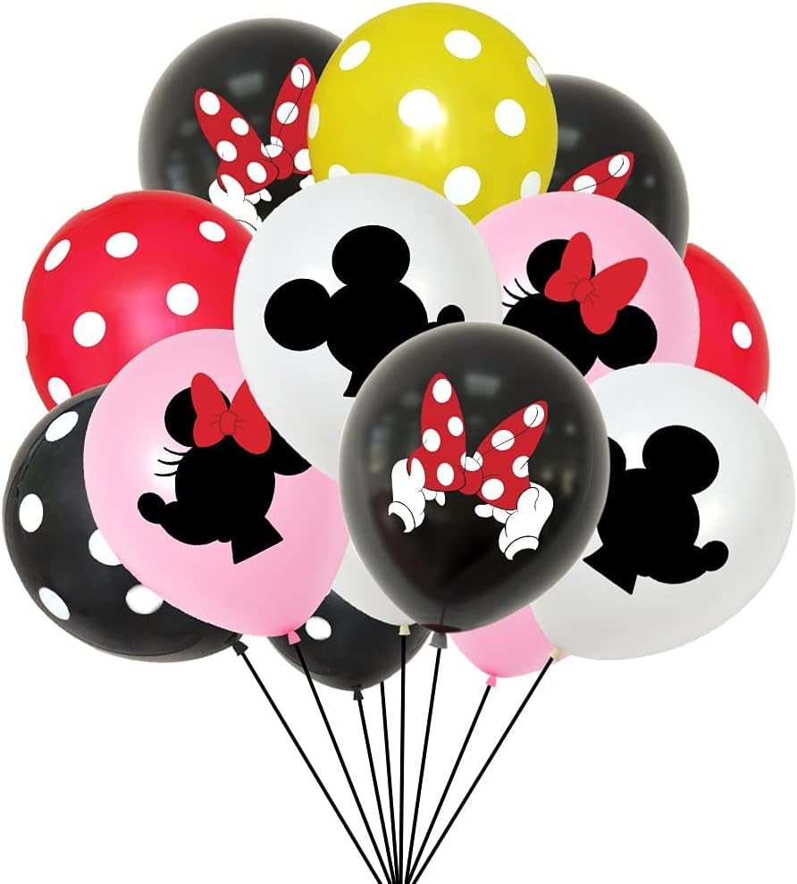 - WHAT WILL YOU GET: 1 X Fish Tail Banner, 1 X Mickey Banner, 1 X Cake Topper, 2 X Minnie Balloon, 2 X Mickey Balloon, 6 X Polka Dot Balloons(2 pc Black, Red, yellow).