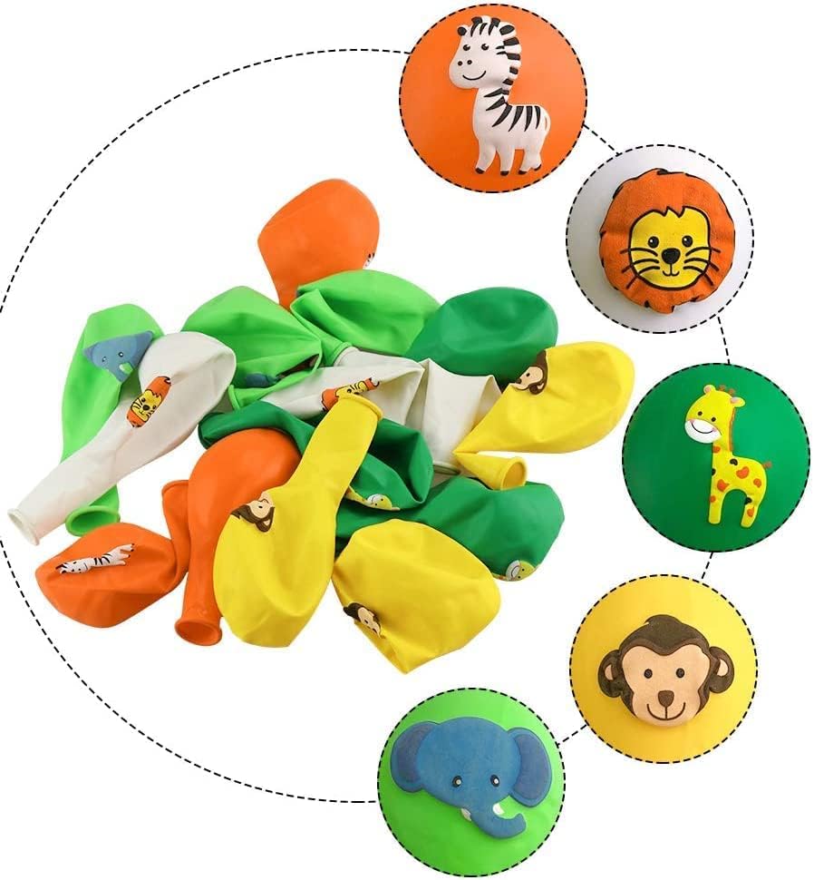 - THE AMAZING ANIMAL DECORATIONS: 5 kinds of 12" latex print balloons. Package include 10pcs balloons: 2pcs Zebra orange latex balloons, 2pcs Giraffe green latex balloons, 2pcs Elephant light green latex balloons, 2pcs Lion white latex balloons, and 2pcs Monkey yellow latex balloons.