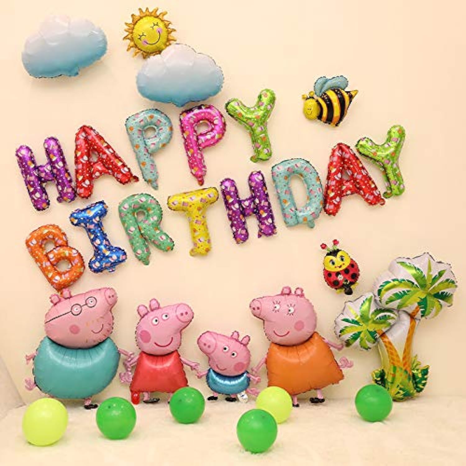 - WHAT WILL YOU GET: 1 X Happy Birthday Balloon Banner (13 letters), 4 X Peppa Family Foil Balloons, 2 X Cloud Foil Balloons, 1 X Palm Tree Foil Balloon, 1 X Mini BEE Foil Balloon, 6 X Latex Balloons (4Pcs Green, 2Pcs Light Green), 1 X Ribbon Roll, 1 X mini–Ladybug Foil Balloon