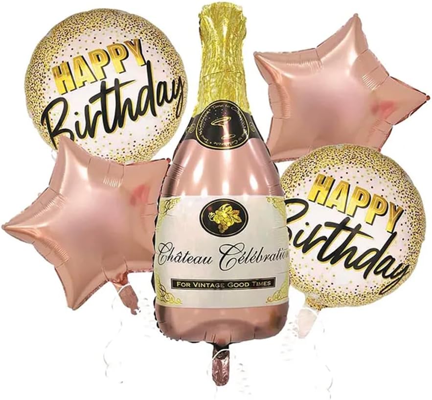 - COMPLETE PARTY BALLOON SET: 5-piece rose gold balloon kit with 2x star foil balloons, 2x round happy birthday foil balloons, and 1x bottle foil balloon.