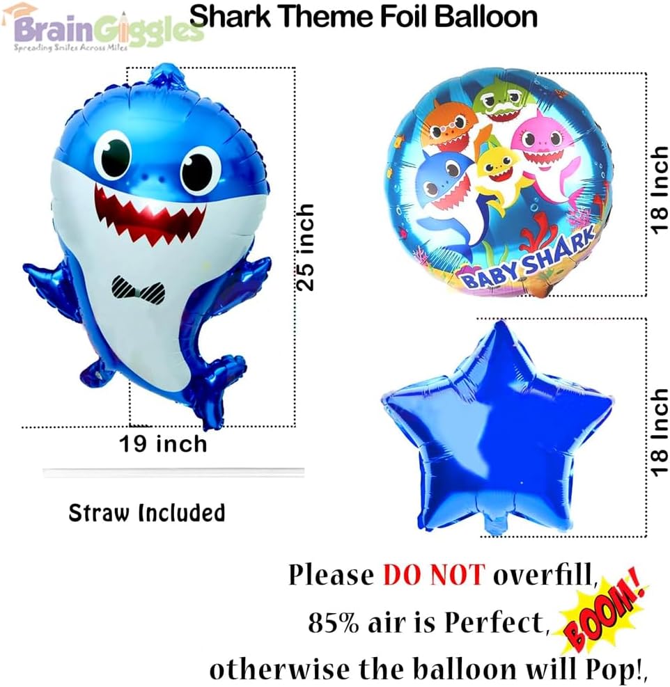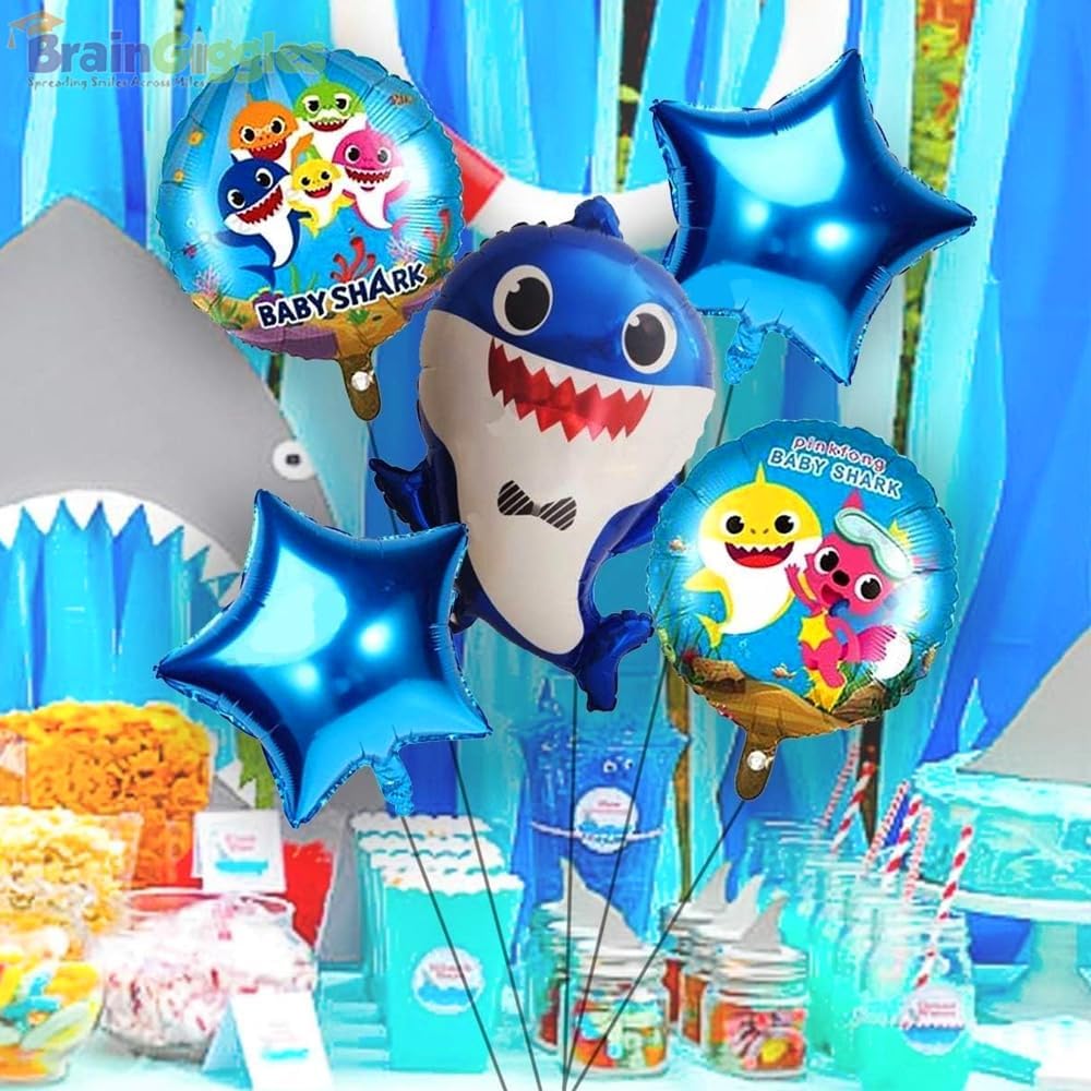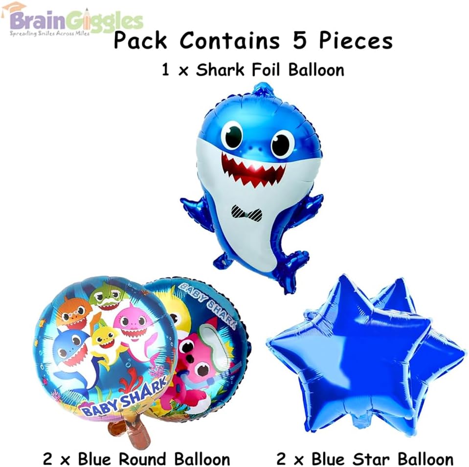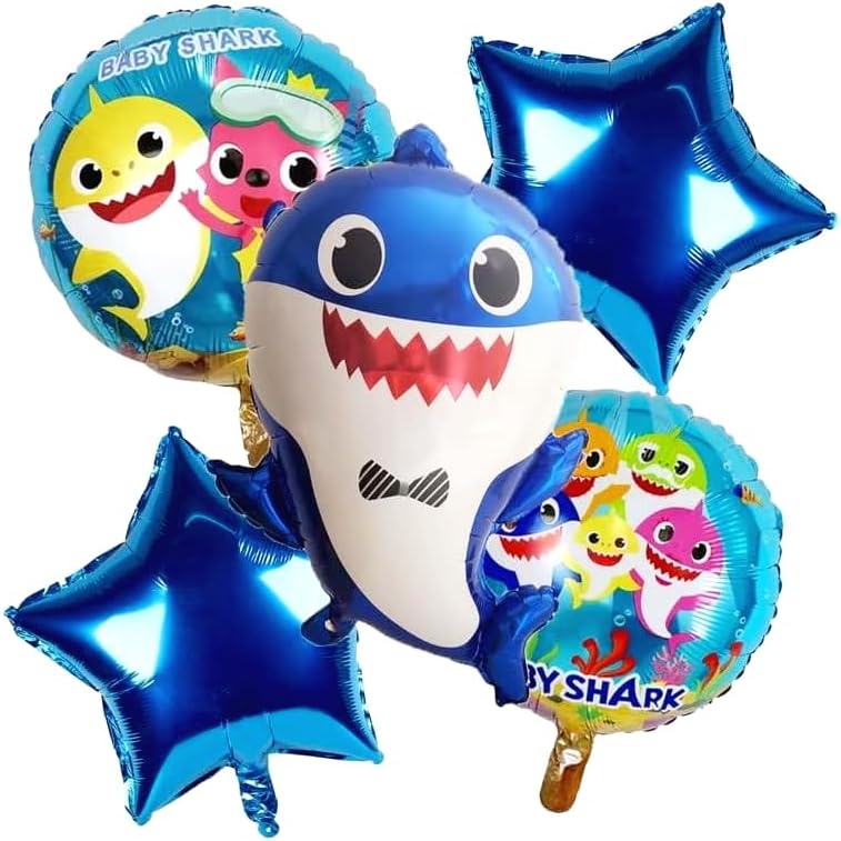 - 5-PIECE BALOON SET: Includes shark balloon, 2 blue star foil balloons, and 2 round shark balloons.