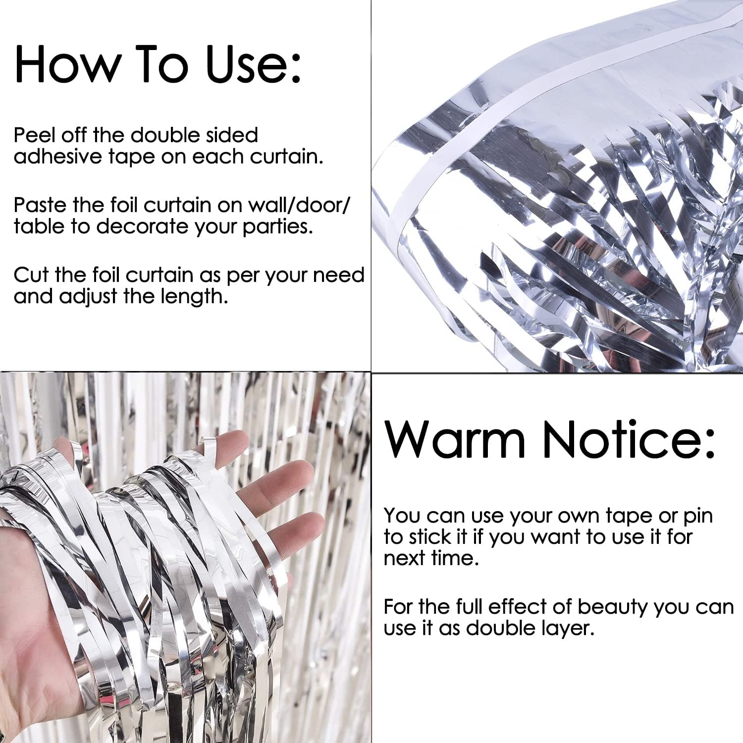 - EASY INSTALLATION: The foil curtain features an adhesive strip on top for easy installation on walls or doors, and can be hung separately or layered for a fuller look, making it perfect for creating a photo booth or party backdrop.