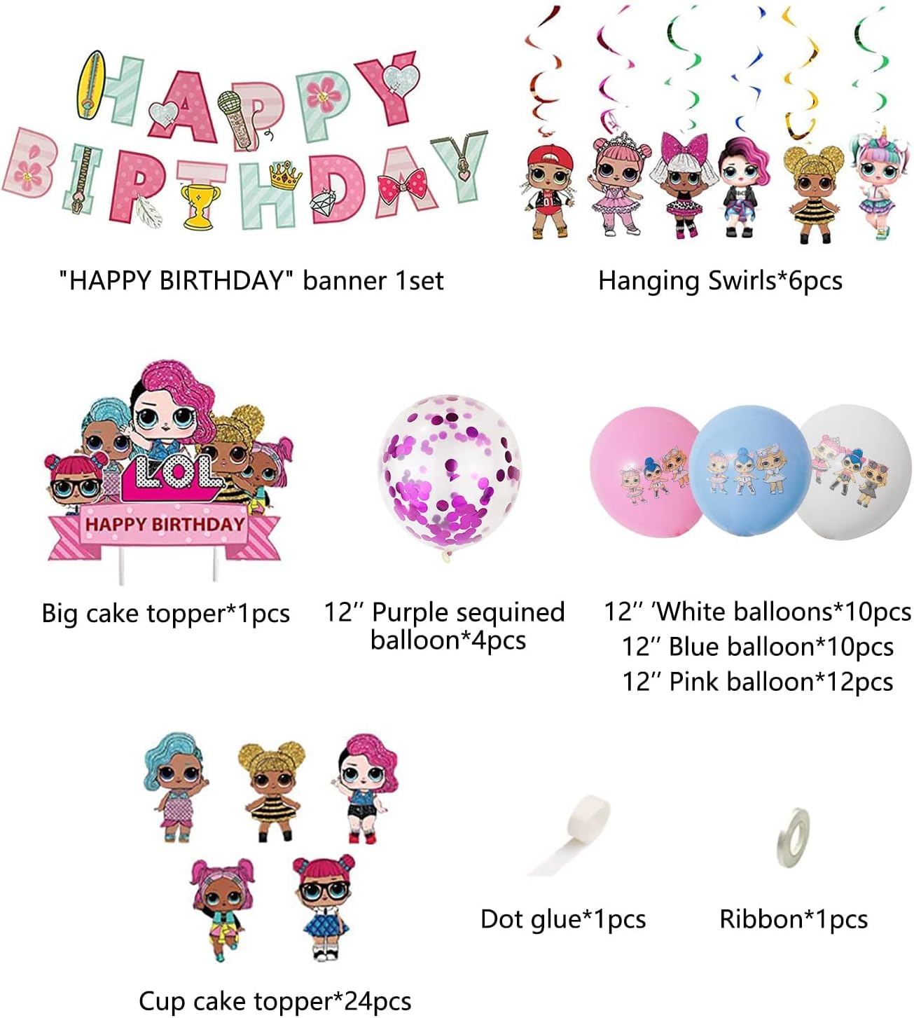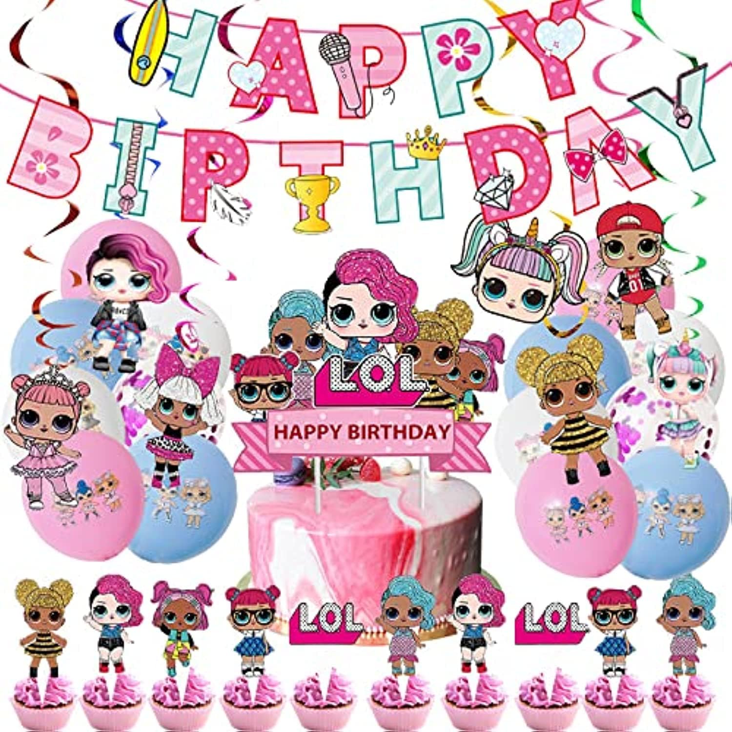 - WHAT WILL YOU GET: 1 x "HAPPY BIRTHDAY" banner, 6 x Hanging swirls, 1 x "LOL HAPPY BIRTHDAY" cake topper, 4 x (12-inch)Purple confetti balloons, 10 x (12-inch)White latex balloons, 10 x (12-inch)Blue latex balloons, 12 x (12-inch)Pink latex balloons, 24 x "LOL" Cup cake toppers, 1 x Glue dot, 1 x Ribbon