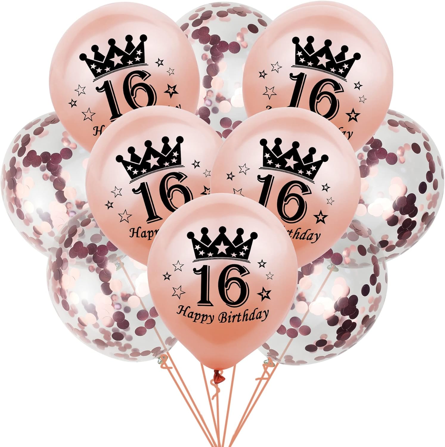 - 16th BIRTHDAY BALLOONS SET: Includes 10 latex balloons – 5 rose gold "16 Happy Birthday" print and 5 clear confetti balloons with rose gold confetti.