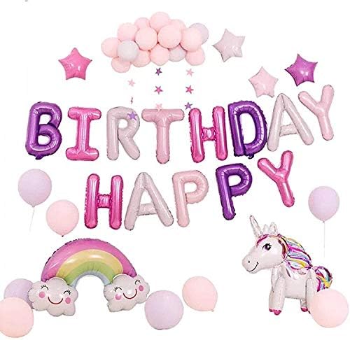 - WHAT WILL YOU GET: 1 x Unicorn foil balloons, 1 x Rainbow Foil Balloon, 25 x Latex balloons (Pink & Purple), 1 x "HAPPY BIRTHDAY" letters banner, 3 x Star Paper Banner, 4 x Star Foil Balloons.