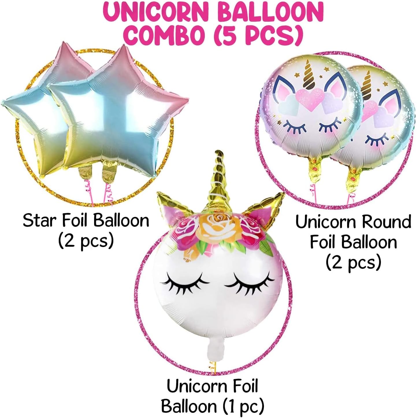 2 Pcs Unicorn Star foil balloons + 2 Pcs Unicorn Printed round foil balloons + 1 Pc Unicorn foil Balloon = Set of 5 Pcs for unicorn birthday decorations.