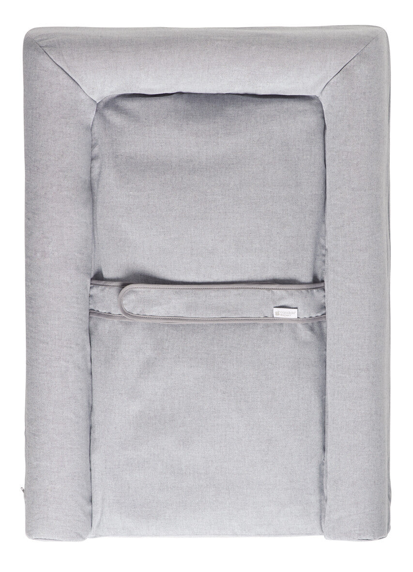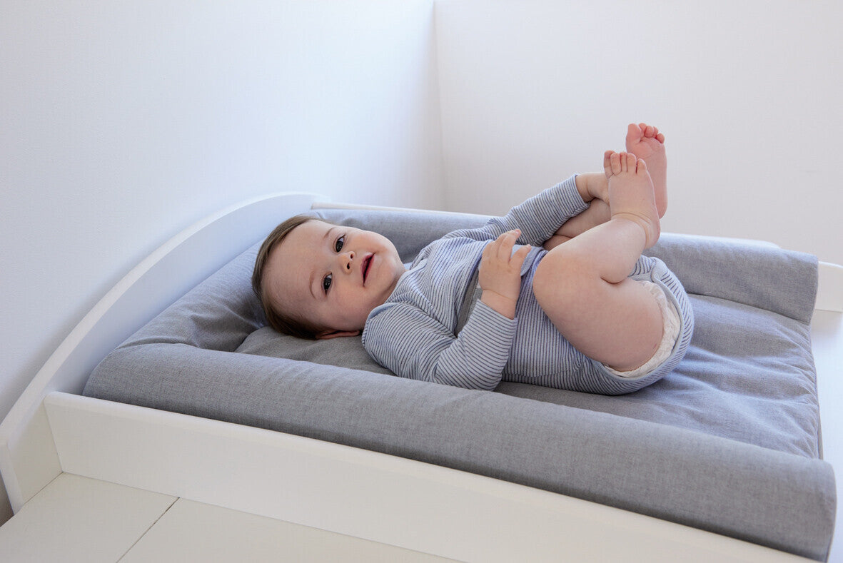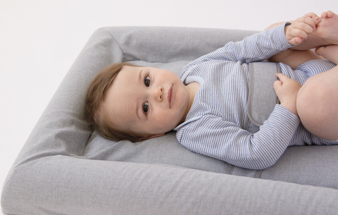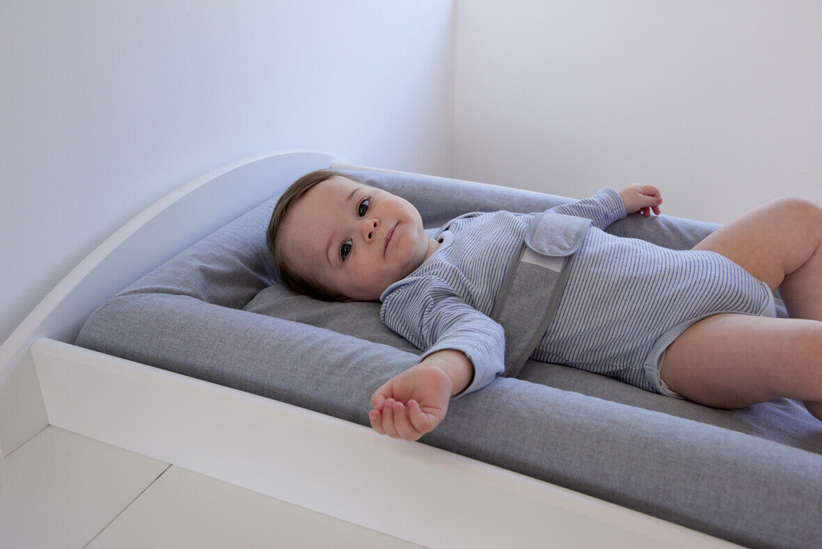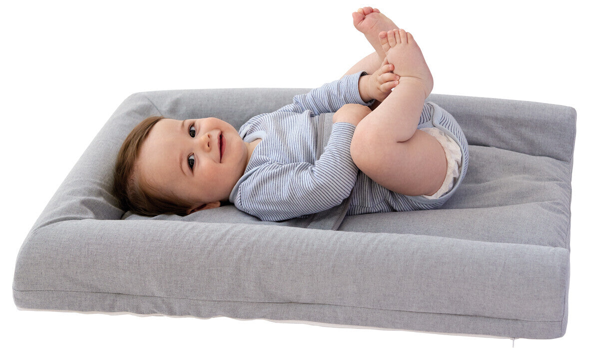 This comfort mat has a raised edges, an adjustable support belt and a non-slip bottom. The combination of foam and beads allows baby to be comfortably wedged during the change. It has waterproof and stain resistant fabric cover.