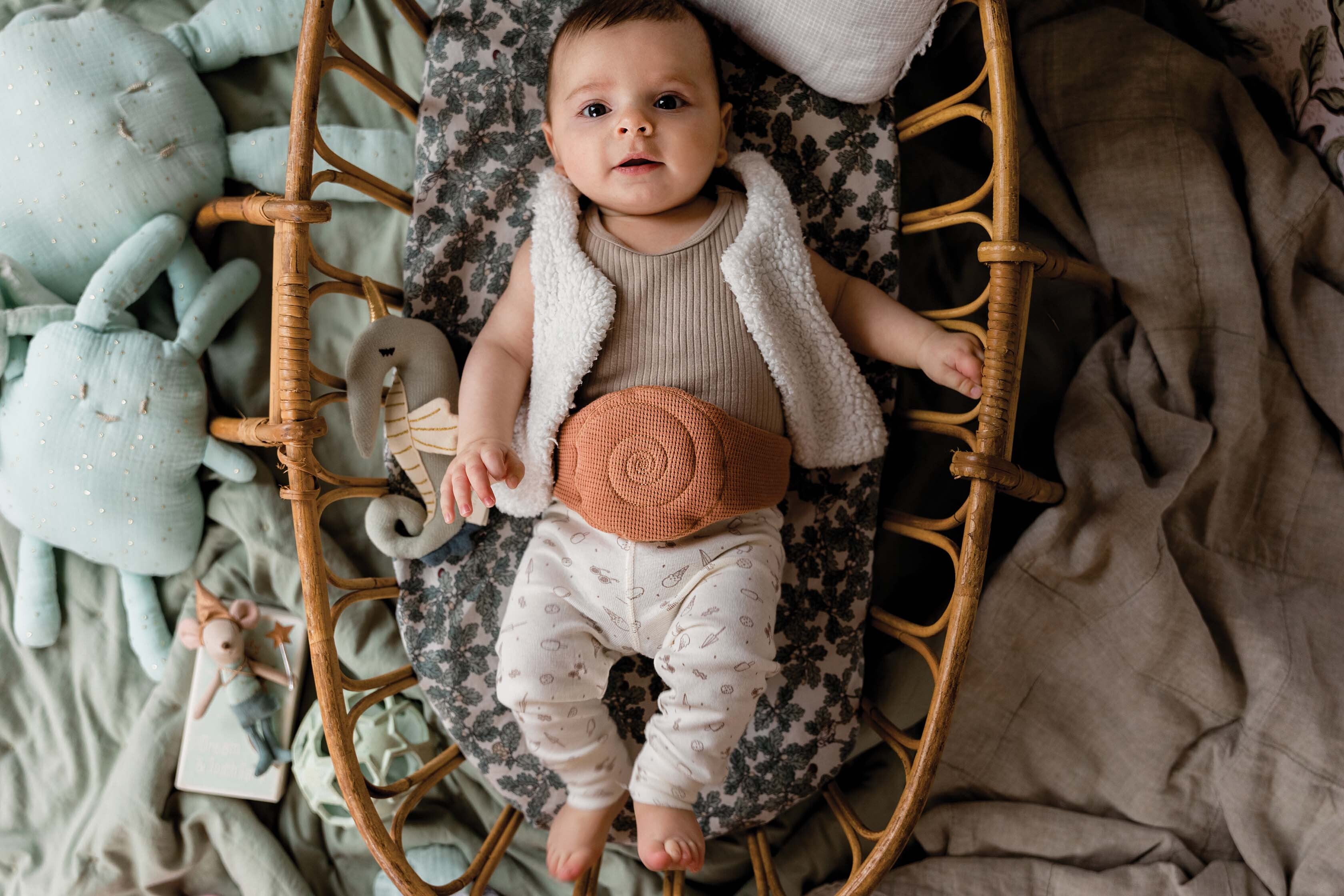 - Rests on babyƒ??s tummy with adjustable with Velcro straps