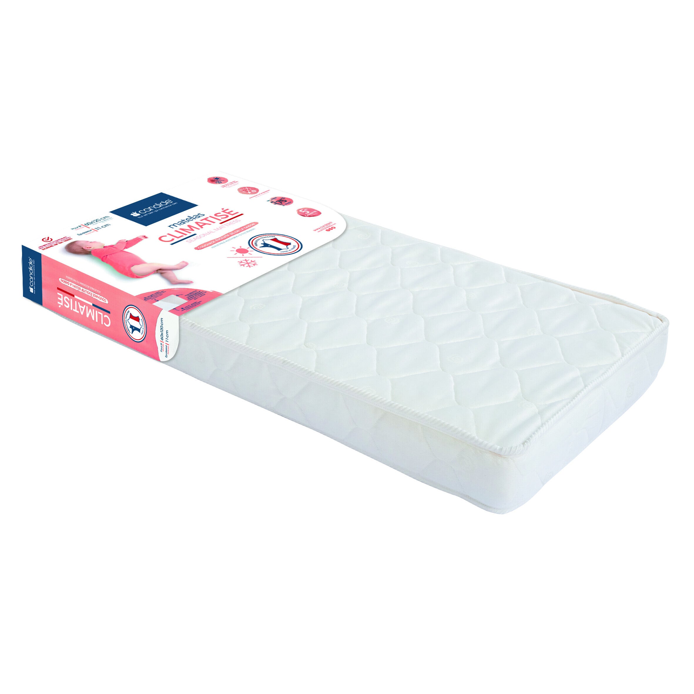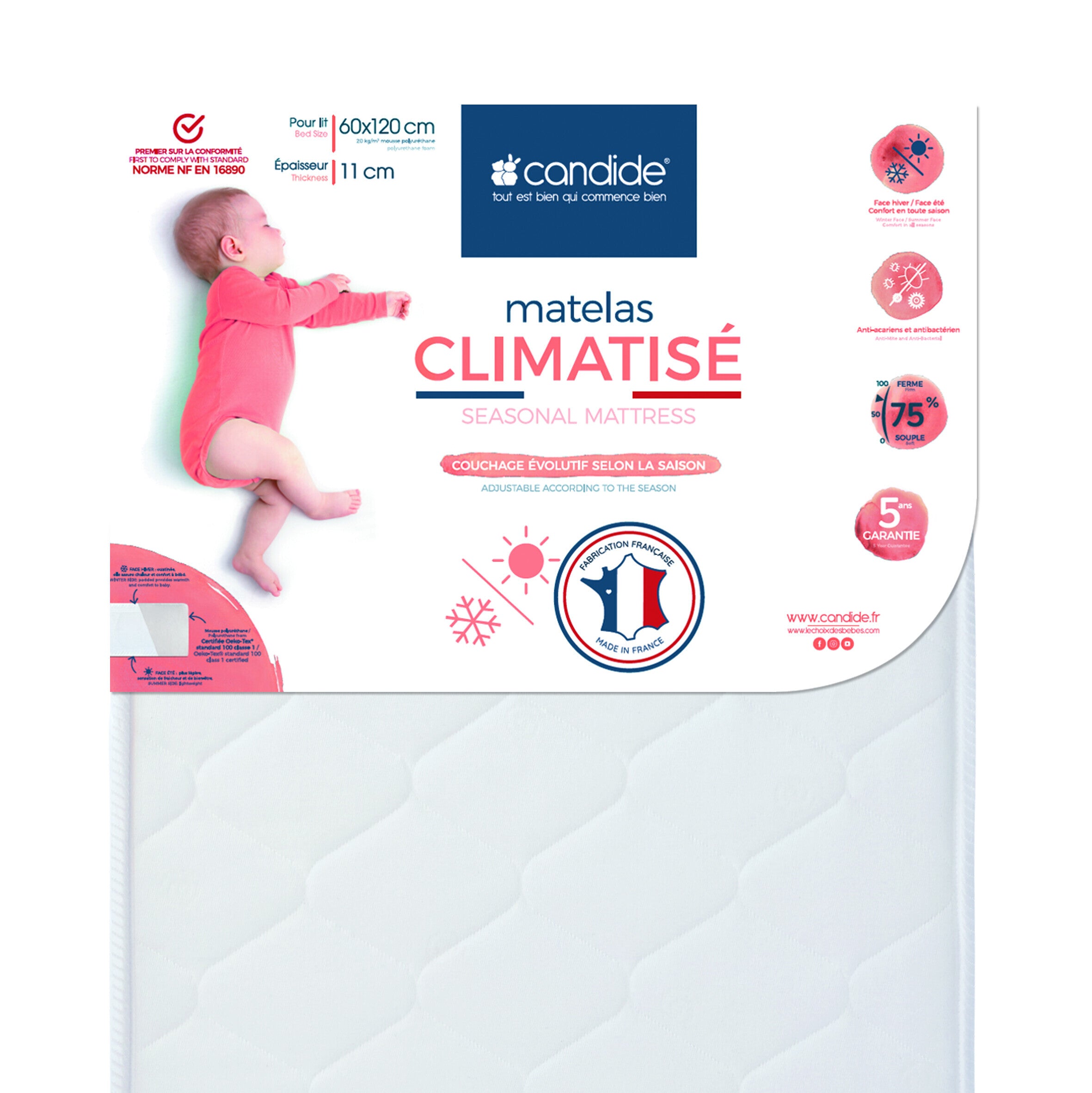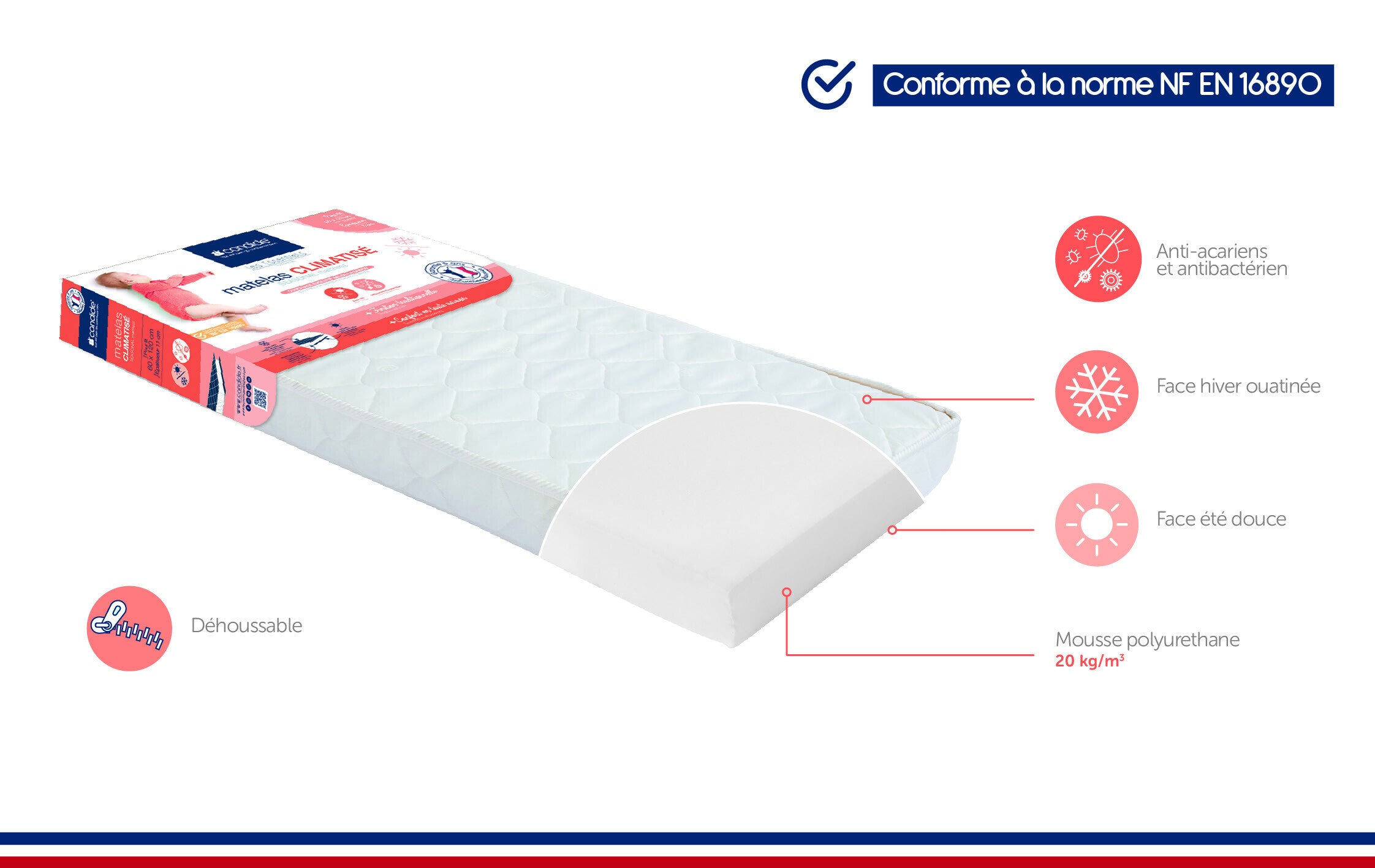 This air-conditioned mattress is made up of 2 sleeping sides, a summer side and a winter side.It has a padded winter side that will keep the heat better so that baby is warm during winter nights; and a lighter summer face in polycotton which prevents perspiration during naps. It is ideal for babies with sensitive skin thanks to its anti-mite and antibacterial feature.
