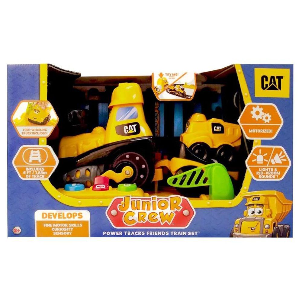 All aboard! The Cat Power Tracks Friends Train Set is leaving the station, next stop your childs imagination! This interactive motorized character train set is sure to captivate your child�s curiosity for hours and teach them a thing or two along the way. Develop fine motor skills while playing by pressing down on the engines helmet to bring the train to life. From there you can control the train�s actions easily using the large brightly colored buttons and toggle switch on the train station command hub. Each color will trigger a different action for the train to perform including tooting the whistle, racing around the track once or three times, and running out of fuel and refueling. The included Dump Truck is along for the ride and can be unloaded from its flatbed carrier to haul around any materials near the tracks. The 6 feet of included track is designed to easily and securely snap together forming an oval so the action is always close enough to stimulate your little ones senses. Real Cat machines are known for their high quality, these toys are no different, built to withstand the tough demands of rugged play these vehicles will be your childïs go-to toy. Appropriate for ages 2 years and up.