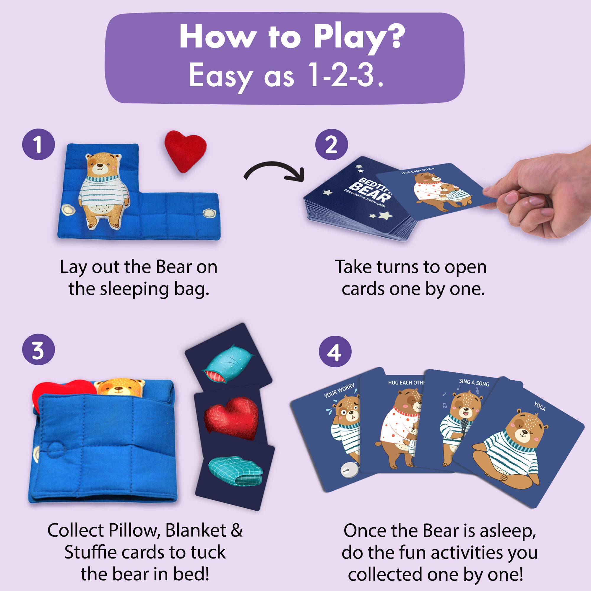 - SIMPLE AND EASY TO PLAY: Draw cards one by one. Collect a Pillow, Blanket, and Heart to tuck in the bear. After the bear is tucked in, complete all the fun activities you’ve collected—like mindful breathing, sharing gratitude, striking yoga poses, dancing, or talking about your day.