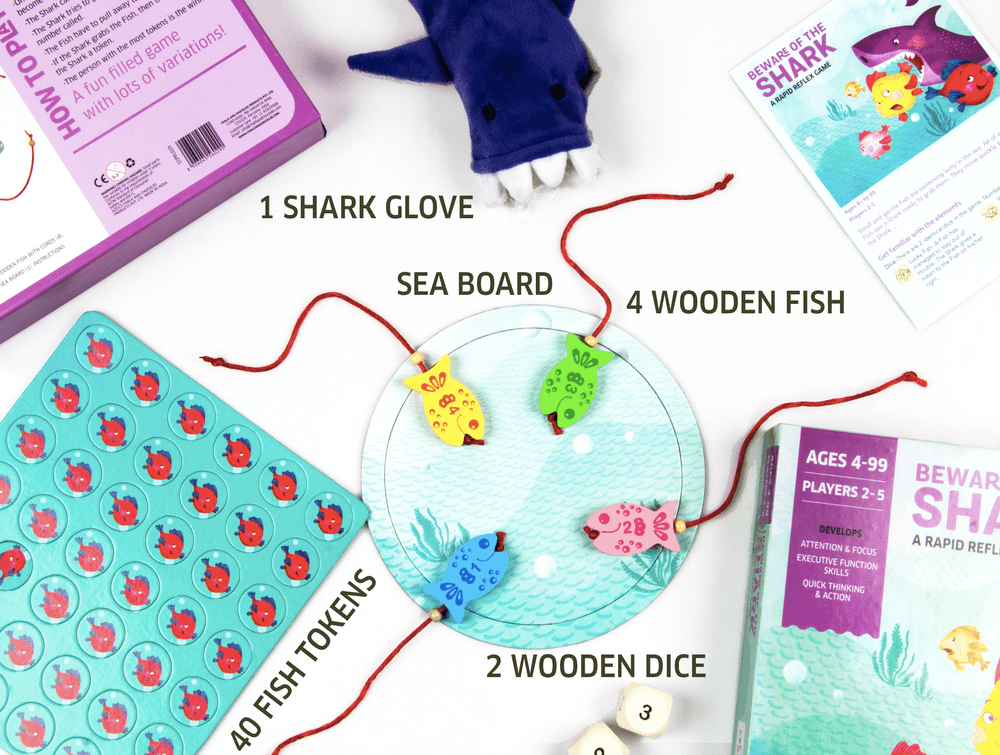 Get ready for laughter, thrills, and fast reflexes with Beware of the Shark – the ultimate action-packed reaction game for kids aged 4 years and up! Danger is lurking in the deep blue sea as one player becomes the sneaky Shark, ready to pounce, while the others play as little Fish trying to escape. Every roll of the dice keeps everyone on their toes—will it be the attack number or a safe swim? Stay focused, react fast, and avoid getting caught! This exciting STEM-aligned game helps children develop concentration, quick thinking, and self-regulation through movement and fun. It’s the perfect screen-free activity for family game nights, playdates, classroom breaks, or travel play. With multiple ways to play, changing rules, and fun props like the Shark glove and wooden Fish, every round brings new surprises and giggles. Ideal for boys and girls ages 4 5 6 7 8 9 10, the game promotes executive function skills, attention span, and teamwork- all while keeping kids active and laughing. Easy to learn and quick to play, it’s a must-have gift for birthdays, Eid, or holiday celebrations.
