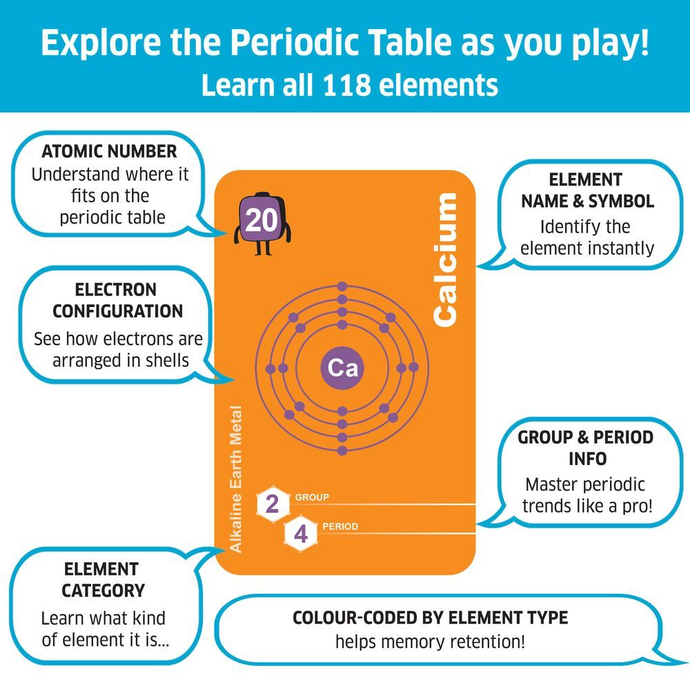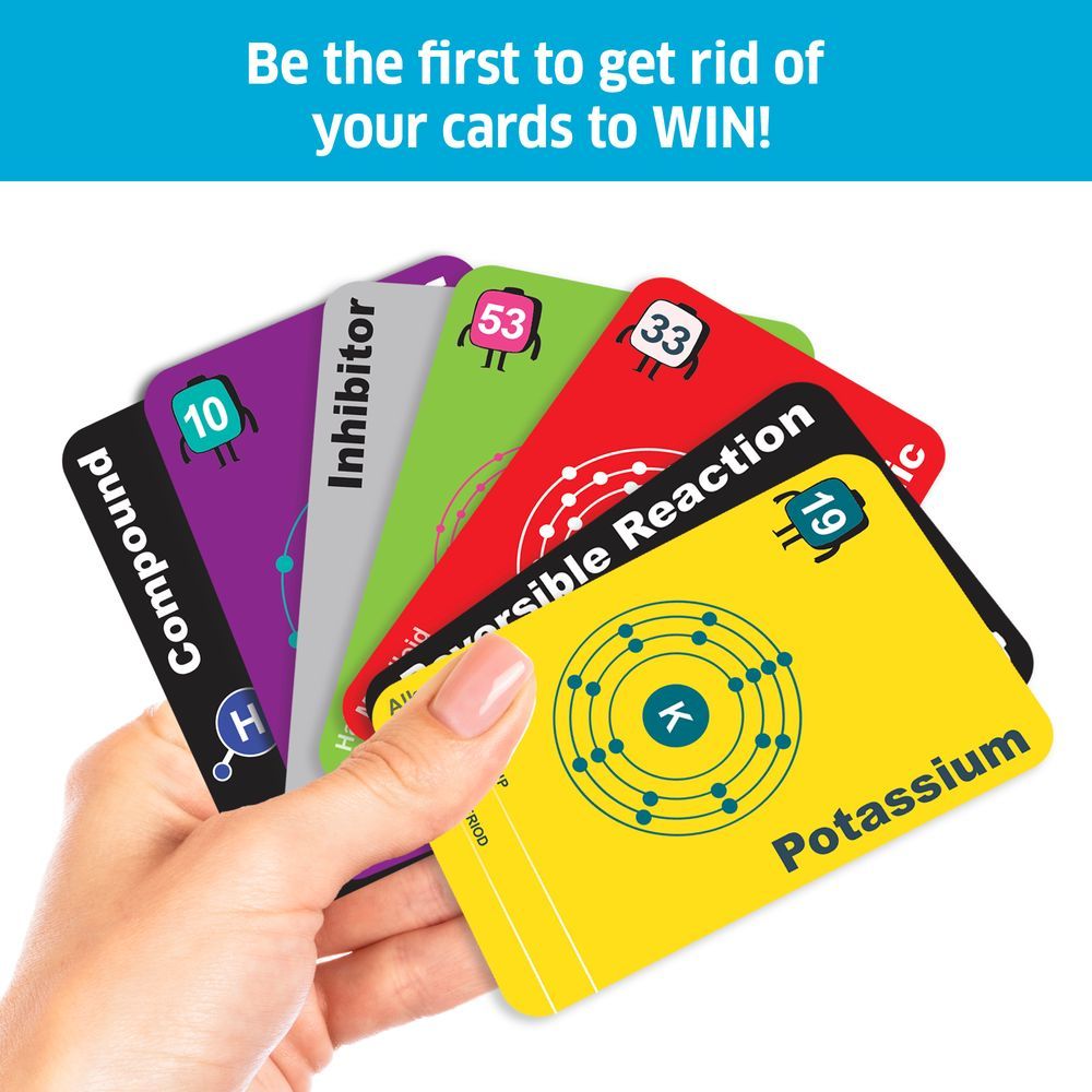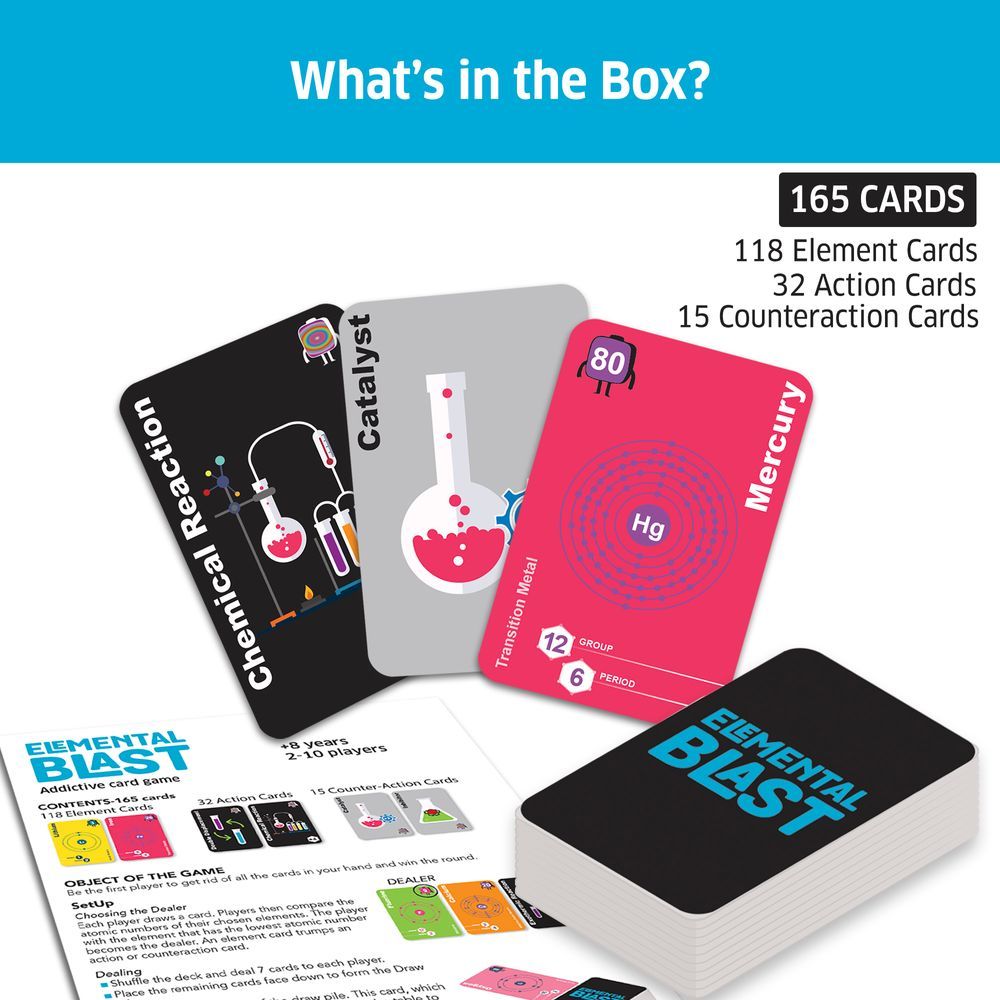 Elemental Blast – The Ultimate Chemistry Card Game for Boys and Girls Ages 8-12, 10-12, 12-14 Years and up Dive into Elemental Blast, an exciting, fast-paced card game where chemistry comes alive! Perfect for boys, girls, and families, players race to match element cards, trigger powerful reactions, and outsmart their opponents. The first player to get rid of all their cards wins! Deal 7 cards to each player, and match them by group, period, element type, or atomic number. Name your element as you play—get caught not doing so, and you'll have to draw 2 extra cards! Action cards like Chemical Reaction +4, Transmutation, and Exothermic Burst can change the course of the game, while counteraction cards like Inhibitor and Equilibrium keep things unpredictable. Learn the periodic table, chemical reactions, and key chemistry concepts—all while having fun! No prior chemistry knowledge required. With 165 cards and easy-to-learn rules, Elemental Blast is perfect for 2-10 players, making it great for family nights, playdates, and even classroom learning. It’s an engaging and educational gift for boys and girls, ages 8 and up, promoting critical thinking and strategic decision-making. Peer-reviewed by PhD scientists and doctors, Elemental Blast is scientifically accurate and guaranteed to be fun for all!