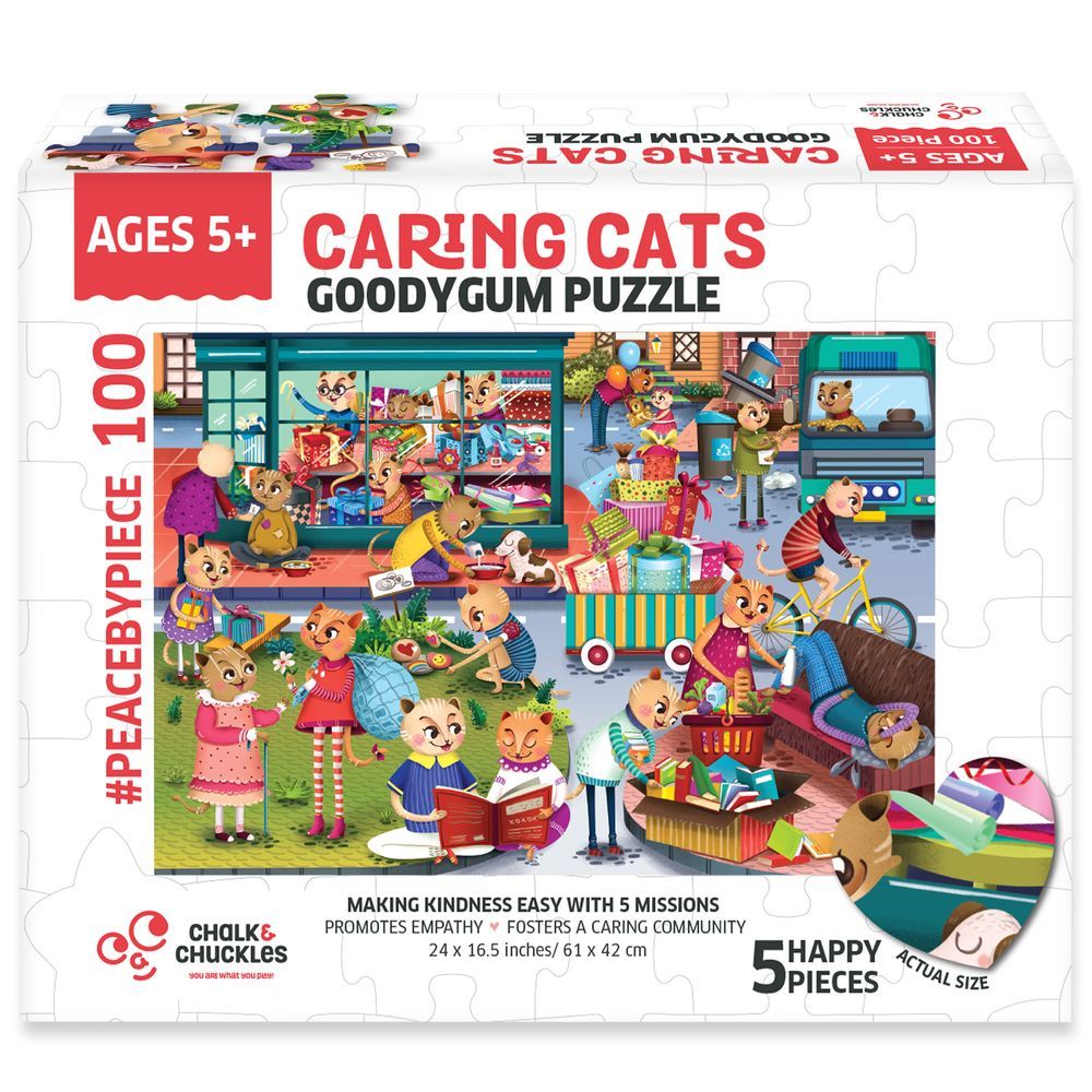 Grow kindness, one act and one puzzle piece at a time. Join Goodygum and her cheerful cat friends in a puzzle adventure that celebrates small, kind actions. As kids build this 100-piece jigsaw, they’ll discover cats helping others, sharing, and spreading joy across a colorful scene. But there's a twist—five puzzle pieces are missing! To earn them, children must complete simple real-life kindness missions hidden in secret envelopes. It’s a fun and rewarding way to connect kindness with play. Goodygum is designed to help children build emotional intelligence and confidence-empathy, gratitude, and confidence, while also improving focus, patience, and fine motor skills. Encourages giving, sharing, and thoughtful conversation. Sparks reflection and connection. It’s perfect for quiet afternoons, gifting, or classroom use. Ages 5–9. A thoughtful and meaningful gift for children who love puzzles, cats, and making the world a little kinder. Great for birthdays, Eid, Halloween, Christmas, BTS