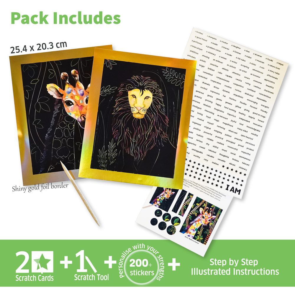 Chalk and Chuckles Animal Power Scratch Art Kit – A Confidence-Boosting Creative Activity for Ages 6–13+ Discover the magic of art with this unique scratch art kit for kids, tweens, and teens! Designed for children aged 6 to 12 years and above, this mess-free DIY craft set is the perfect screen-free activity to spark creativity, focus, and self-expression. Kids will create two beautiful animal portraits- a bold lion and a graceful giraffe- by simply scratching away the surface with a wooden stylus to reveal stunning art underneath. Whether they follow the patterns or let their imagination take over, the results are always beautiful and rewarding. More than just a drawing activity, this kit includes 200+ strength stickers to personalise the final artwork. Children can celebrate what makes them unique- building confidence and emotional intelligence as they create. This scratch art kit is completely mess-free and glue-free, making it the perfect activity for both home and travel. Parents appreciate that it’s made from safe, non-toxic materials and meets international safety standards. It’s also a thoughtful and versatile gift—ideal for birthdays, Eid, party favors, or school rewards. Whether for a girl or a boy, this creative kit is a hit with children aged 6 to 13 years, keeping them engaged, inspired, and proud of what they create. Whether you’re looking for a craft kit for girls 9–12, a creative gift for teens, or a thoughtful DIY project for kids, Animal Power Scratch Art is a perfect choice. Let your child create something meaningful and display-worthy!