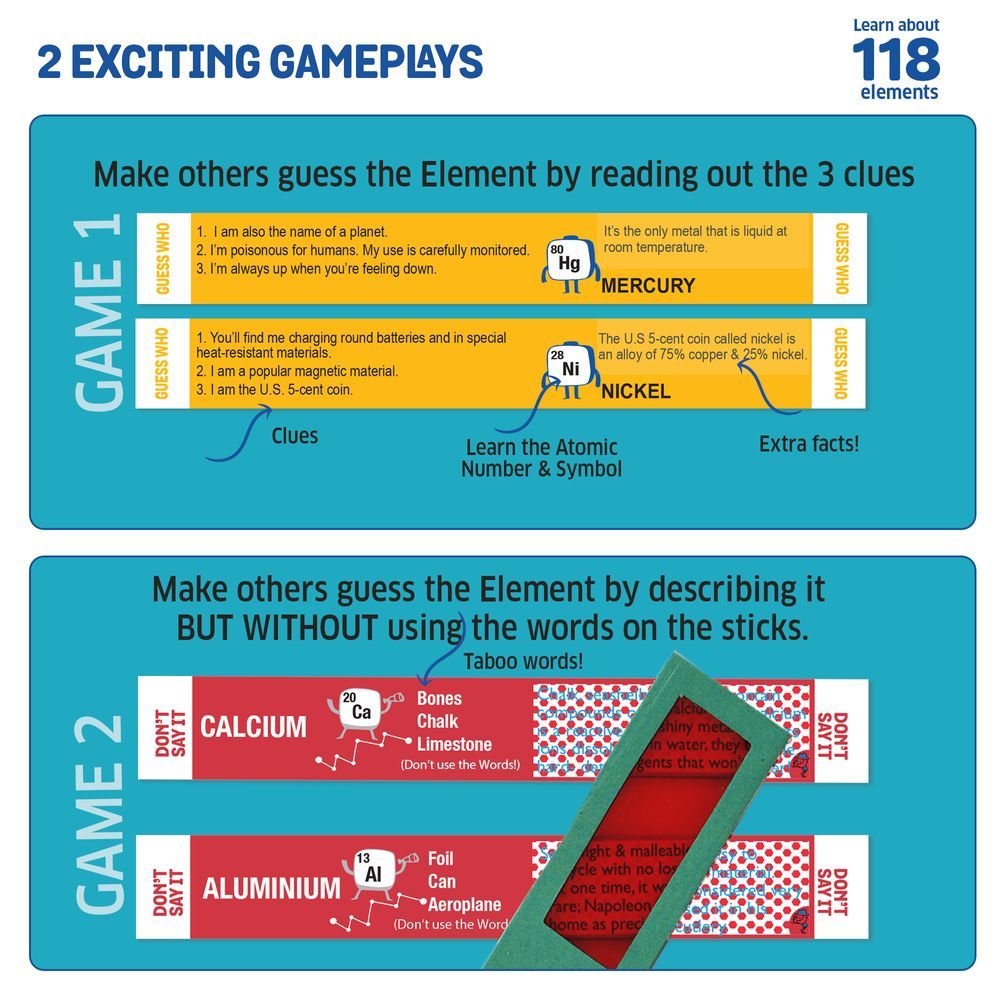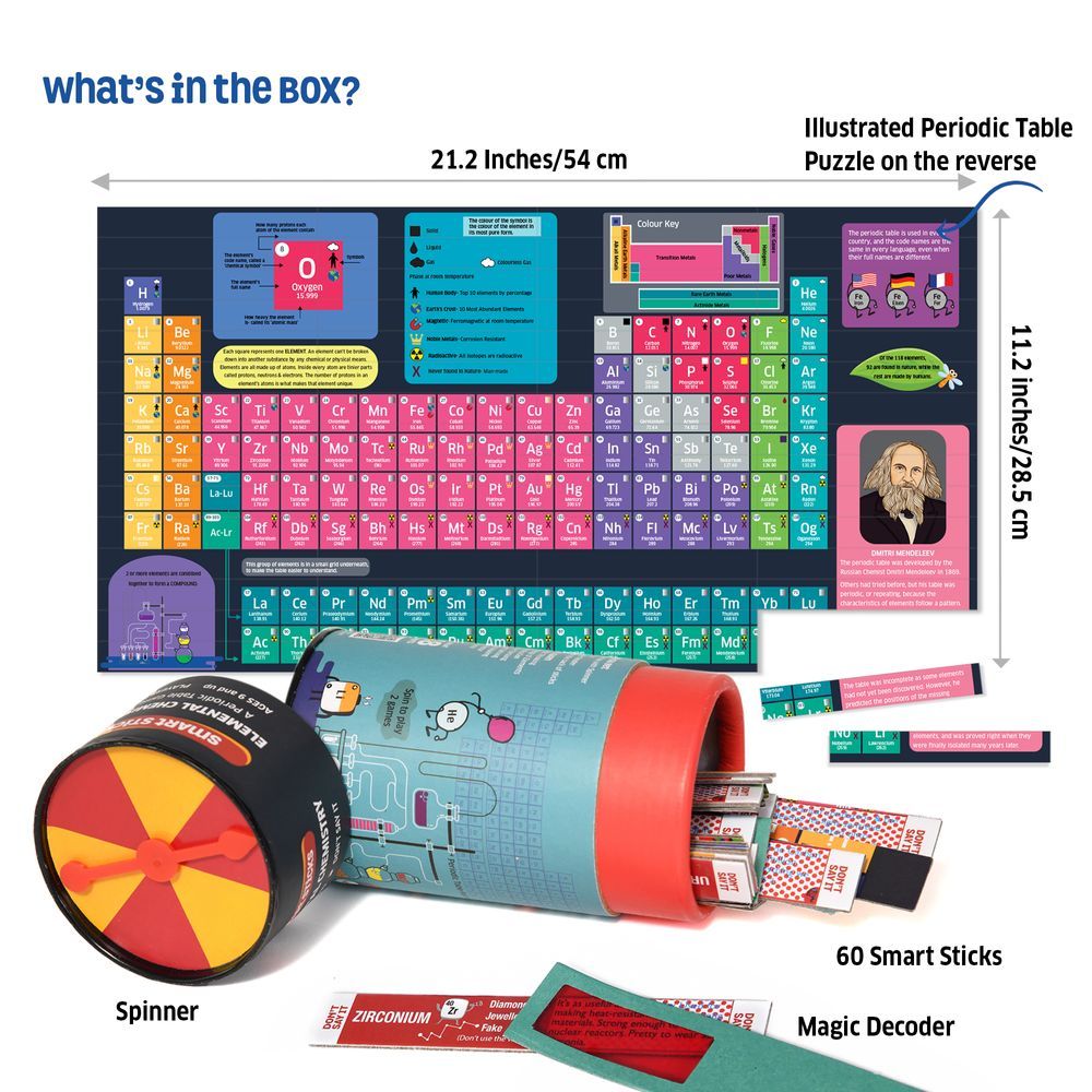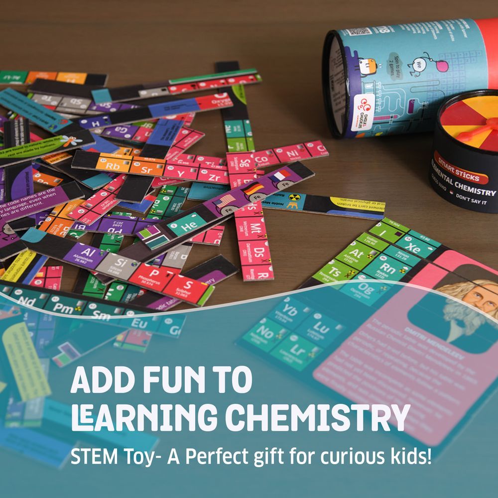 Introduce your child to the fascinating world of chemistry with the Chalk and Chuckles Smart Sticks Elemental Game – an innovative STEM toy for kids aged 8 to 14 that makes learning about the periodic table incredibly fun and engaging. This educational science game helps kids explore the 118 elements, including their names, symbols, atomic numbers, atomic mass, and real-world uses. Packed with 60 Smart Sticks and a spinner, kids can enjoy two interactive games: Guess the Element Game – Use clues to make others guess the element without saying the taboo words! Periodic Table Puzzle – Flip the sticks and piece together a full periodic table for visual learning. Perfect for use at home, in classrooms, or during family game nights, this STEM toy promotes critical thinking, memory building, and scientific curiosity. Whether your child is already a science lover or just starting to explore, this game provides a good learning experience that sticks! The compact packaging makes it travel-friendly and ideal as a birthday gift, Christmas gift, Eid gift, or return gift for kids aged 8-12. It's also great for older children up to age 14 who want to deepen their chemistry understanding in a fun way. If you're looking for science experiment kits, logic games, or educational toys for kids, this chemistry-based puzzle game is the perfect fit. Inspire curiosity. Encourage learning. Make chemistry fun!