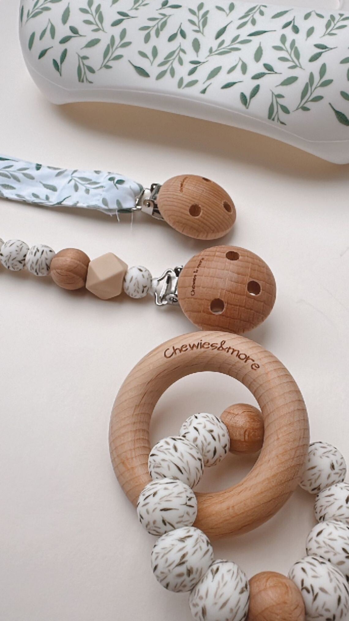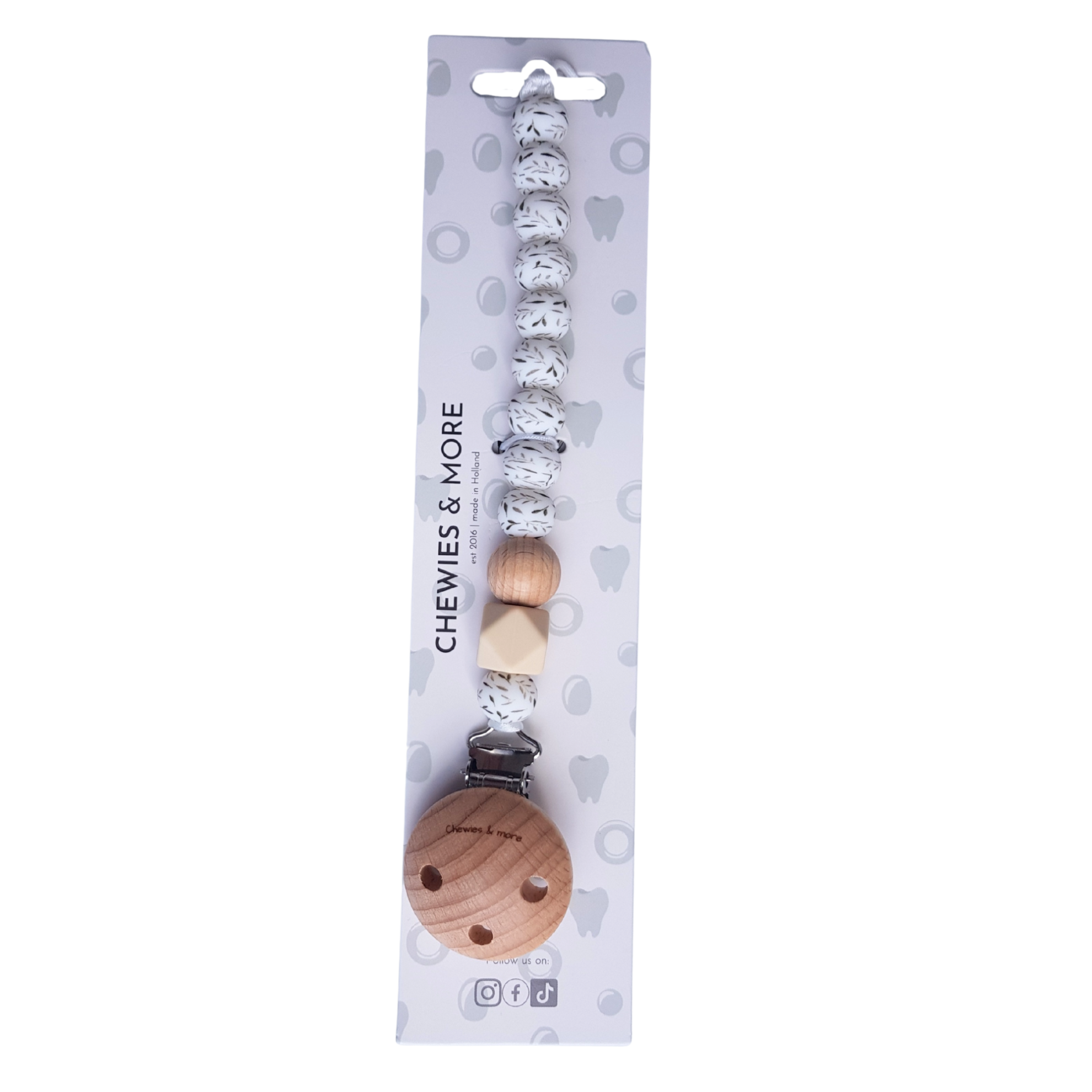 The silicone can be cleaned with water and mild soap. You can wipe the beech wood with a damp cloth and let it air dry. A baby wipe also works well for this! A Chewie cannot be boiled, put in the sterilizer or in the dishwasher.