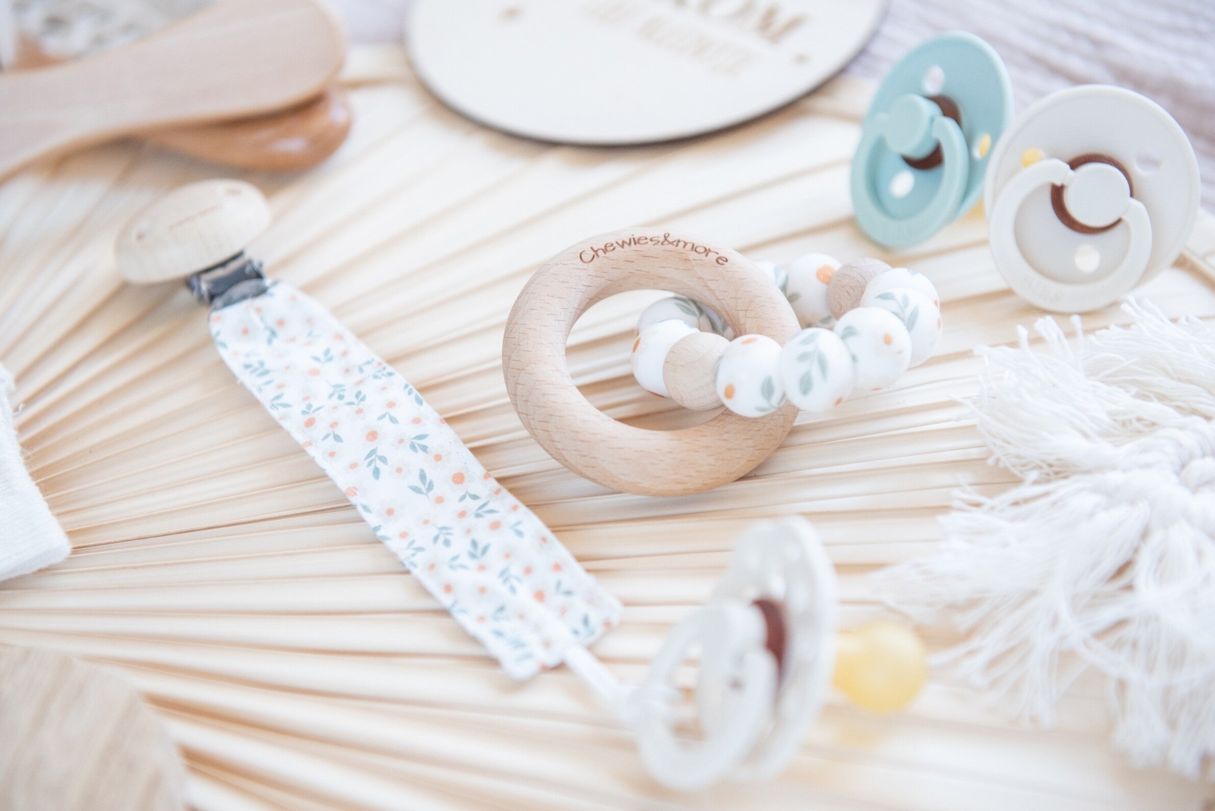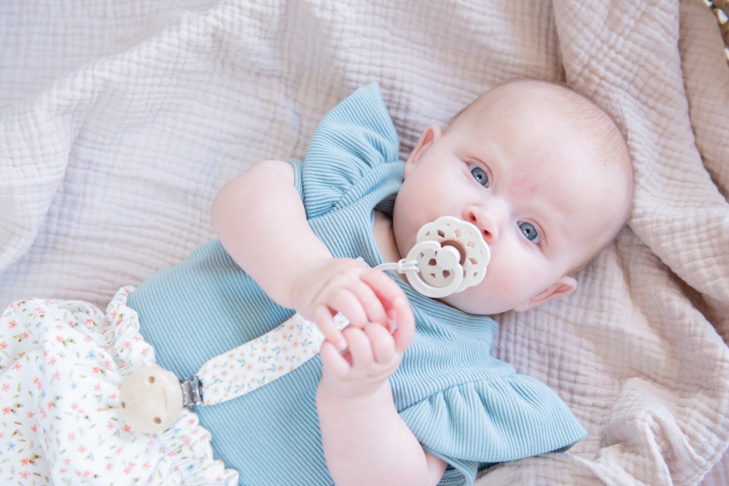 Our clips are all made according to European safety standards and are made by hand in the Netherlands. The safety of your little one is the most important! Do not use this pacifier clip as a toy, teething toy or in bed, it is a tool. The cord including the loop and excluding the clip is a maximum of 21 cm long.