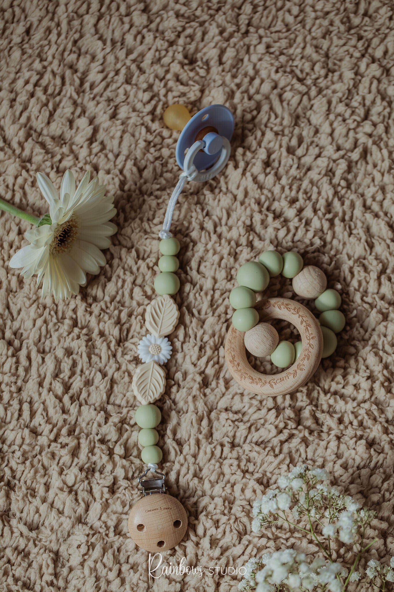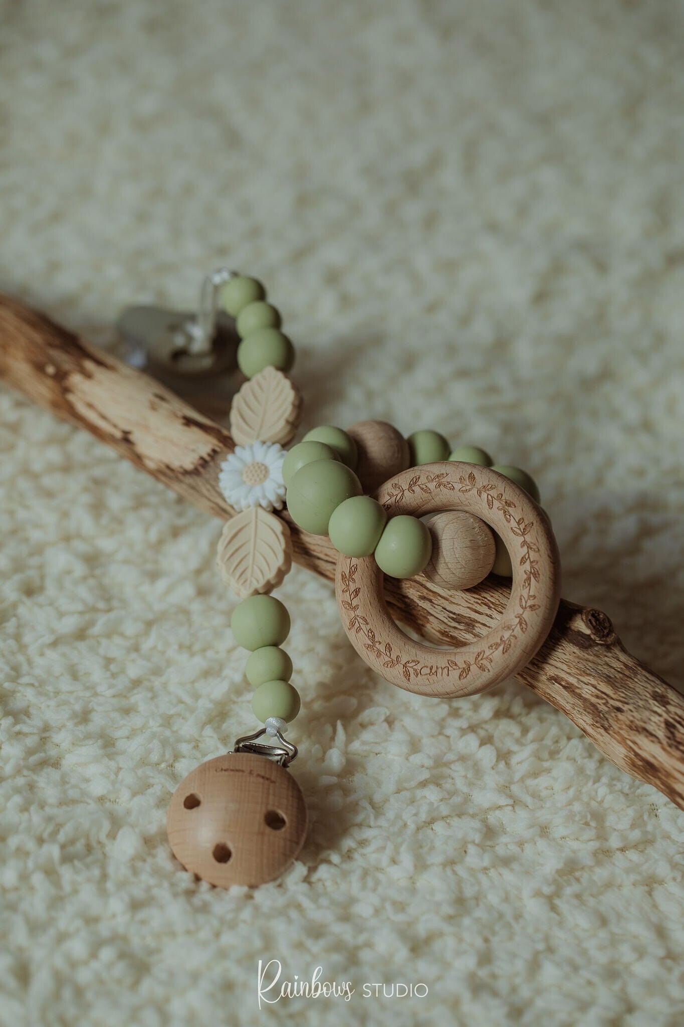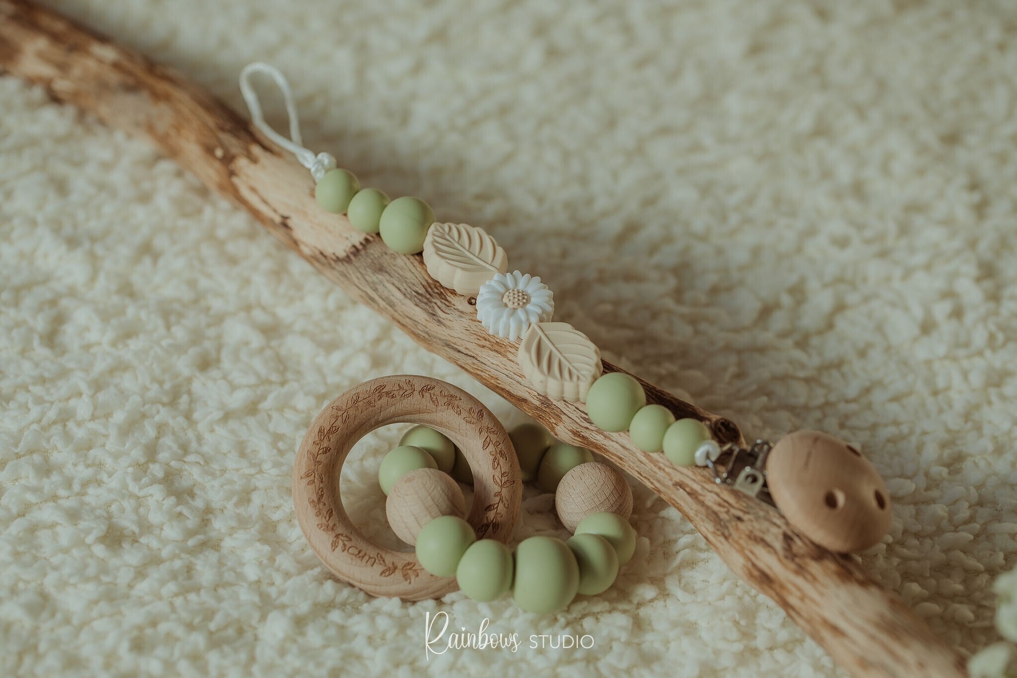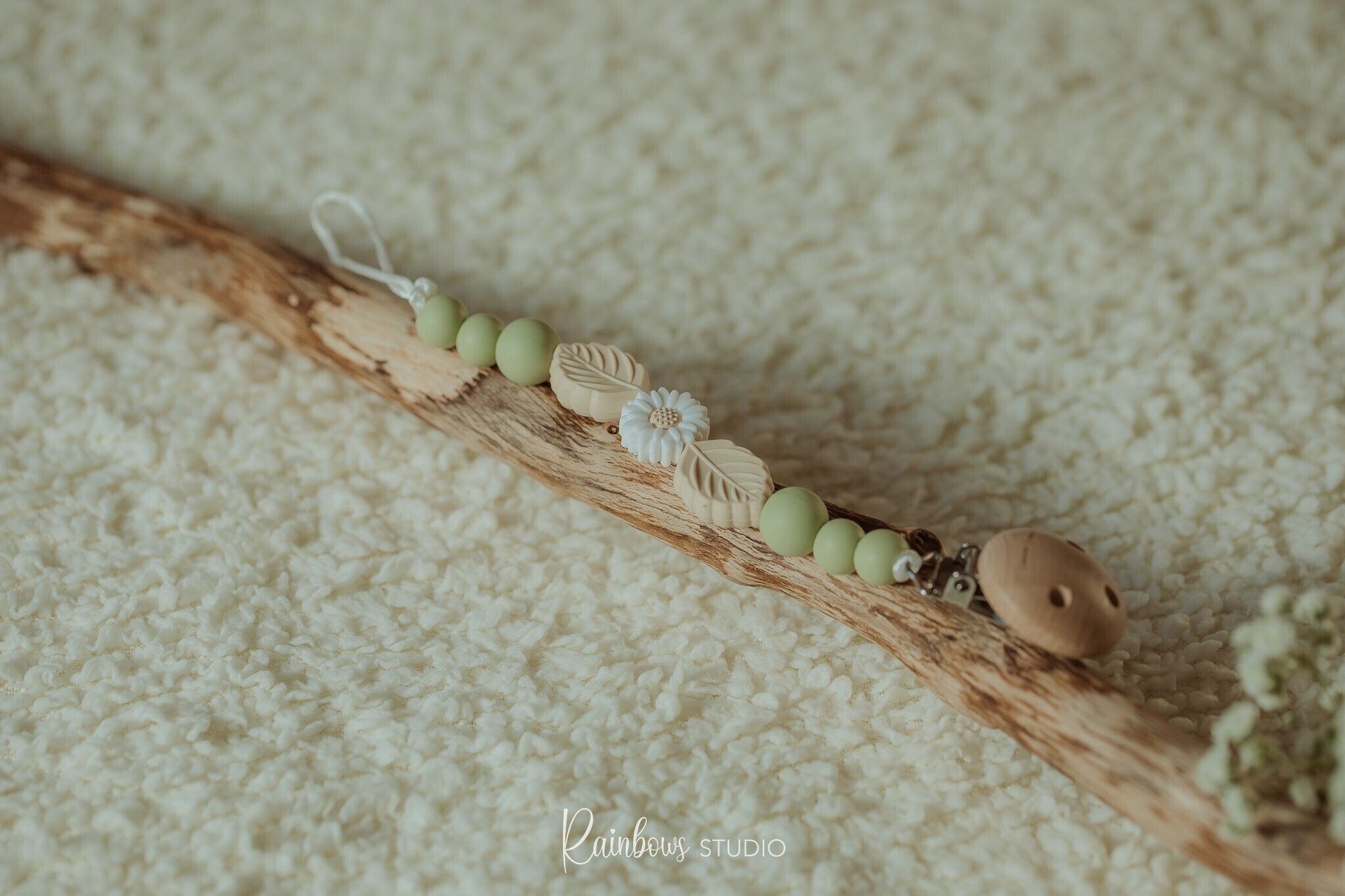 The Silicone Daisy Clip is super light and mobile due to the leaf-shaped bead in the middle.