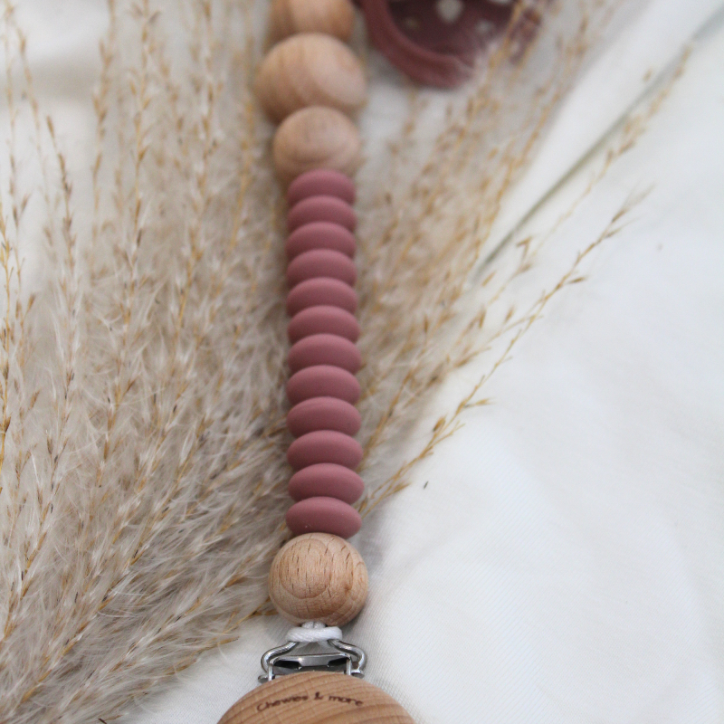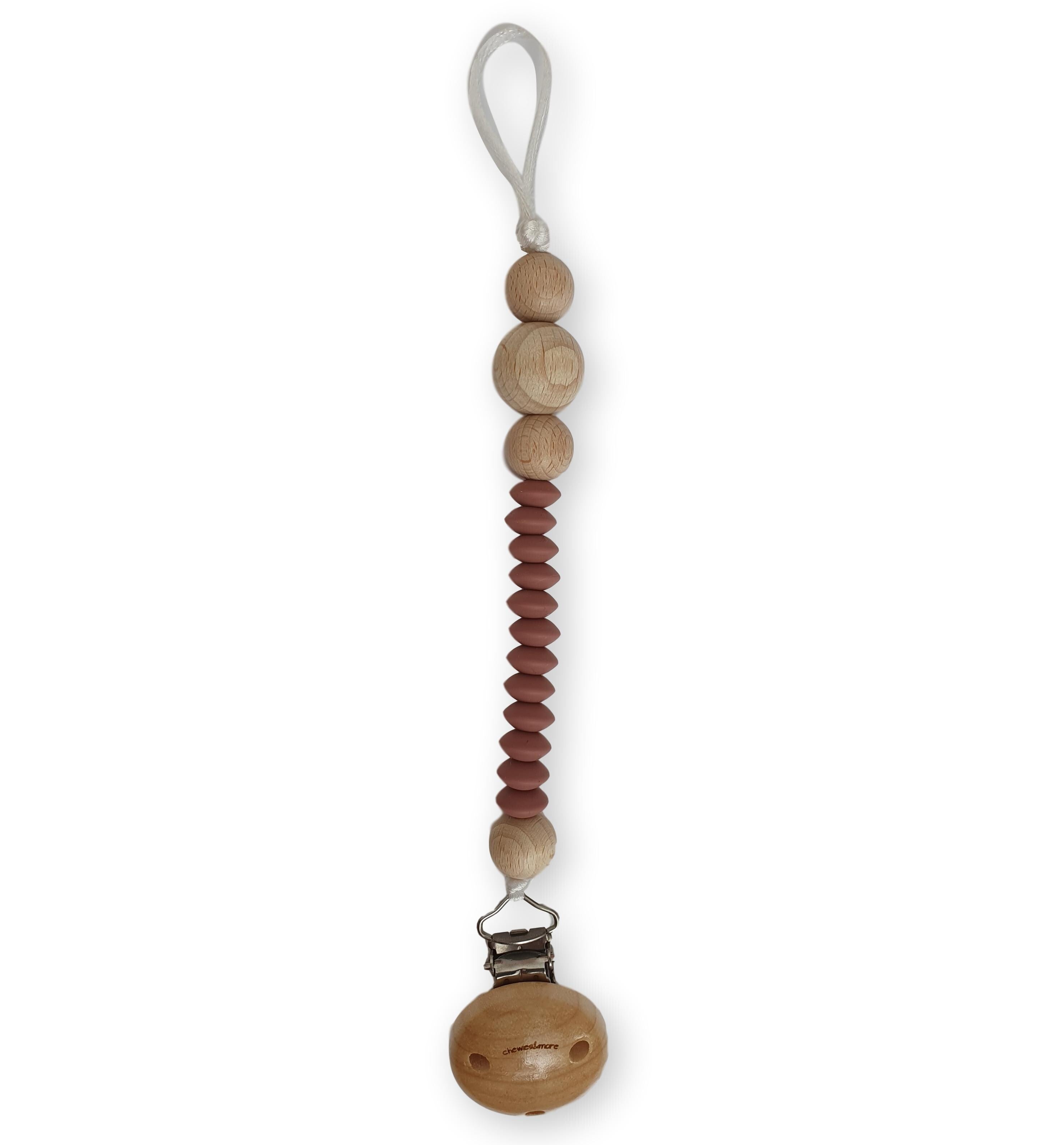 This new Clip is super light and mobile due to the small lentil shaped beads. Pacifier clip made by silicone and wood. Attaches to all pacifiers. Designed to keep baby’s pacifier safe.