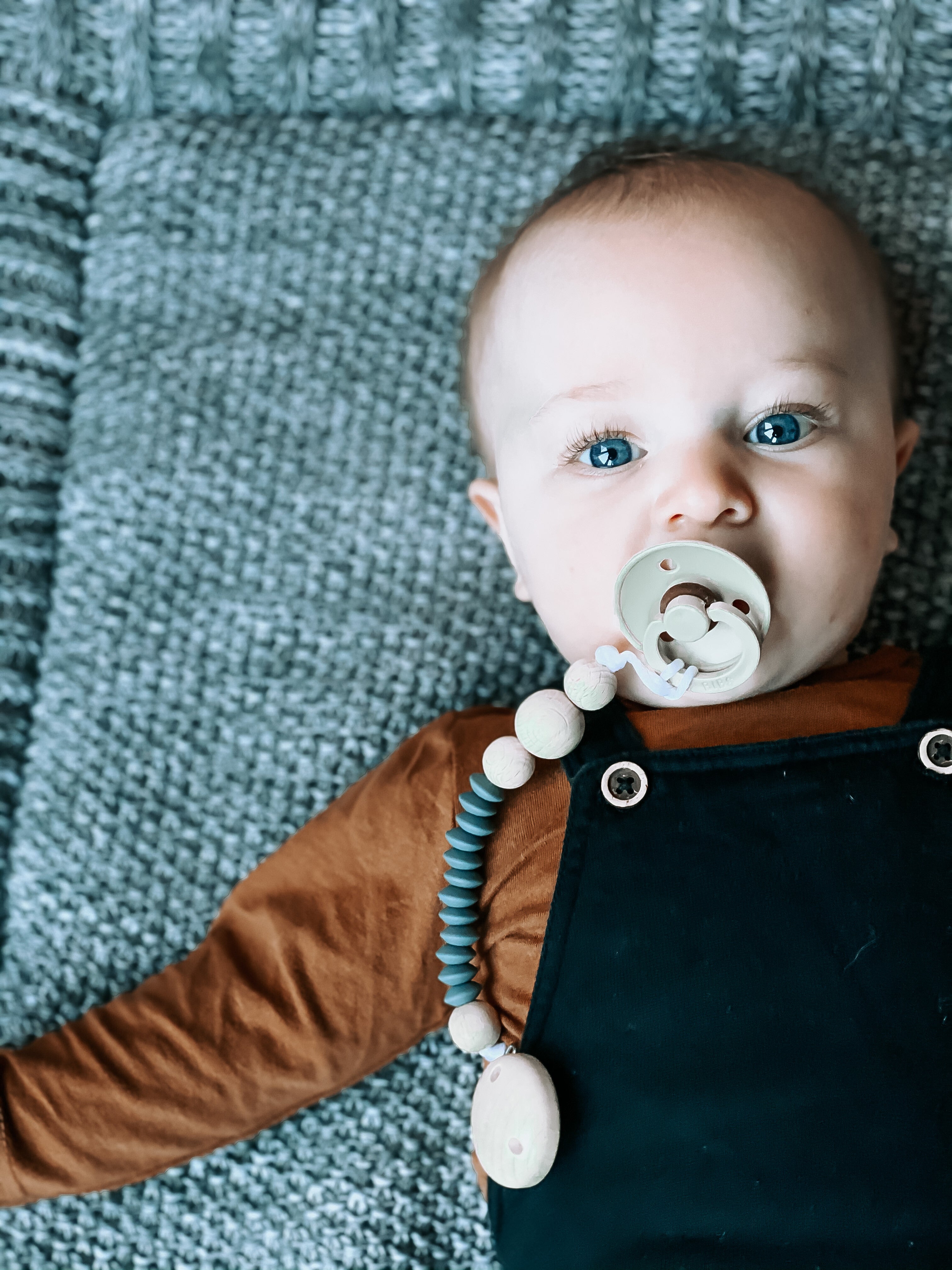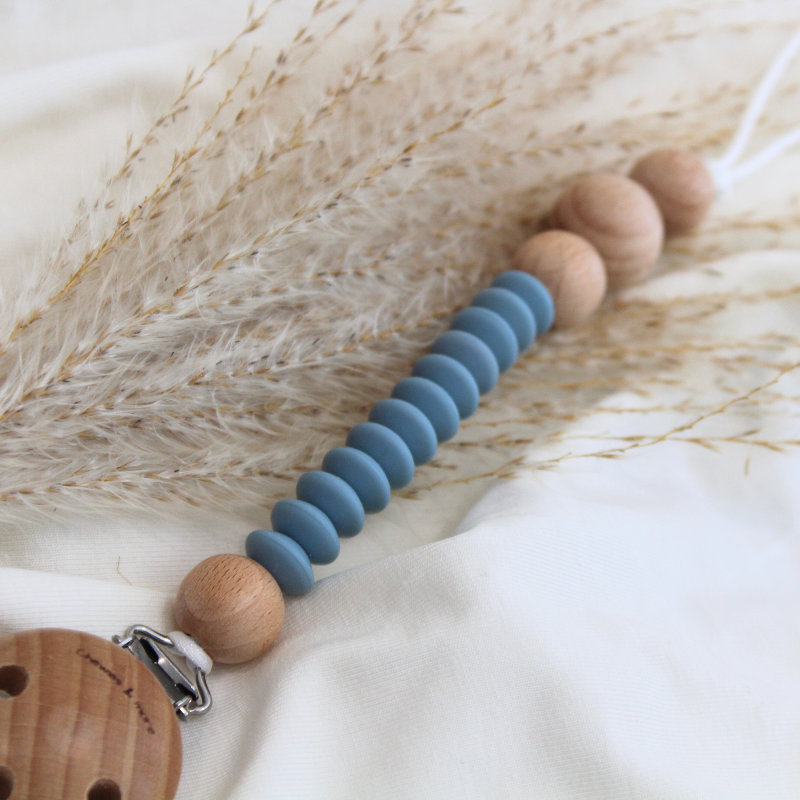 This new Clip is super light and mobile due to the small lentil shaped beads. Pacifier clip made by silicone and wood. Attaches to all pacifiers. Designed to keep baby’s pacifier safe.