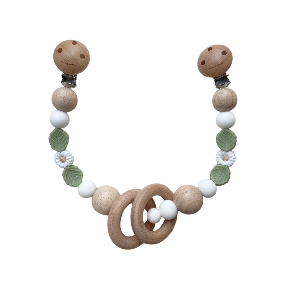 Our handmade Pram /Car Seat tensioners are a real eye-catcher. Furthermore, the tensioners are ideal for on the go for when your baby needs entertaining. The tensioners are easy to click on and off. We use silicone beads, wooden beads and wooden rings for this range. The tensioners can also be matched as a set from our Chewies or Clips ranges.