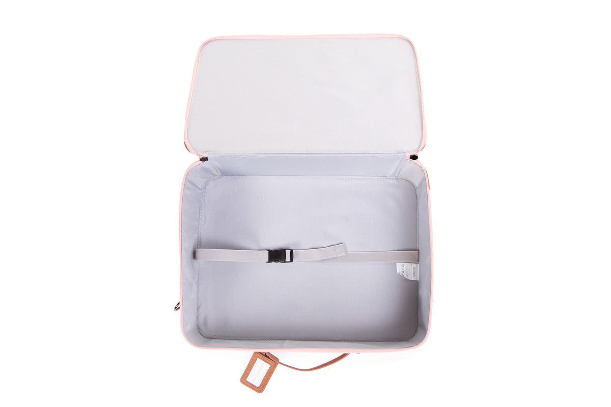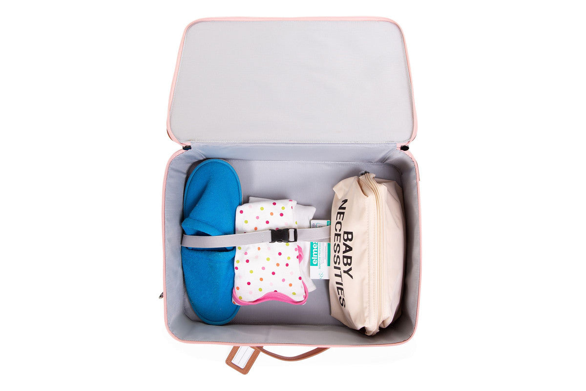 The beautiful travel case consists of 1 large compartment, but has a handy elastic inside to keep everything tidy. Perfect for one or more nights. The Mini Traveller comes with a handy carrying strap. A nice extra is the label to write down your kids name and personalize the Mini Traveller.