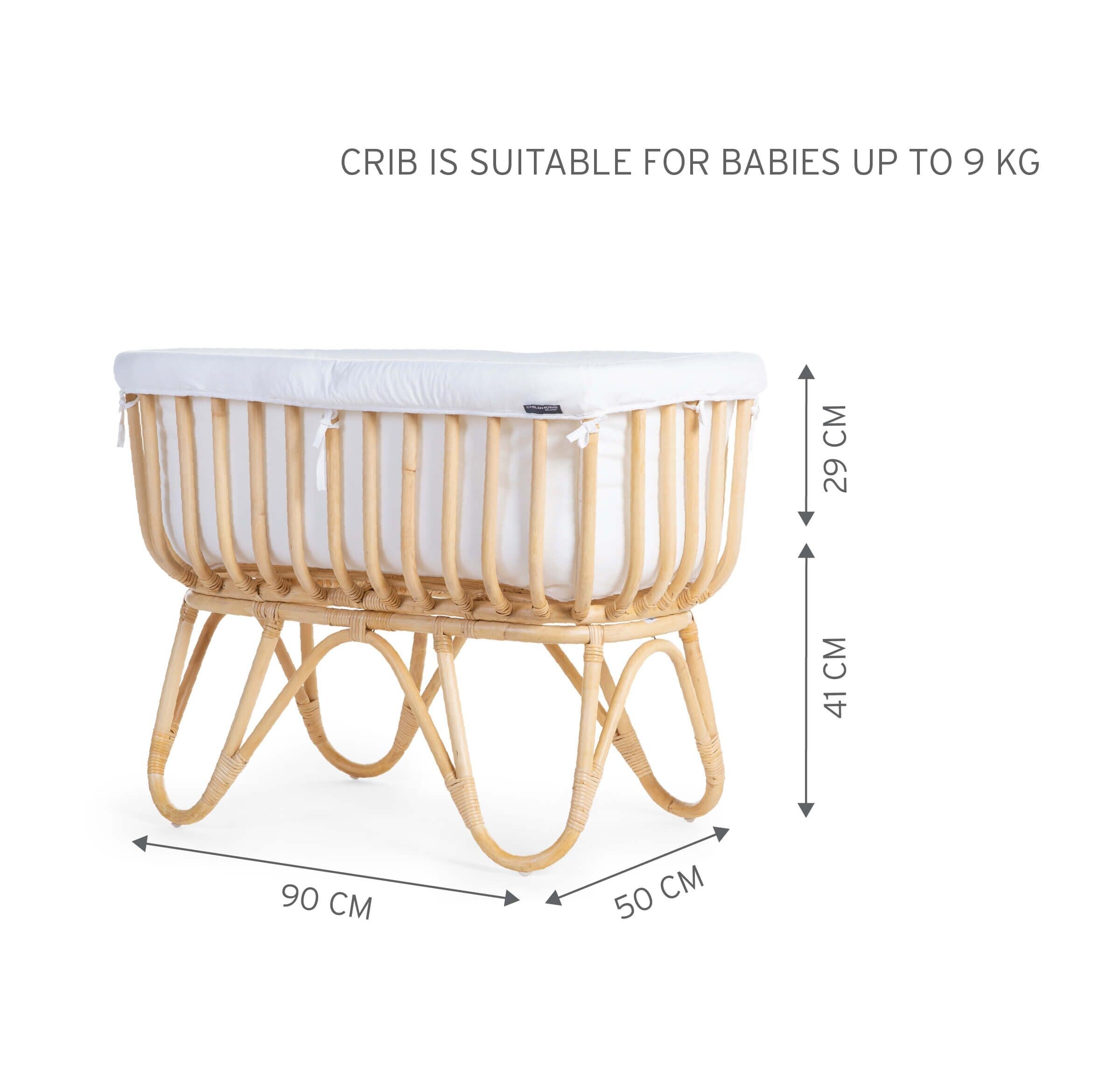 The crib is very light so you can easily move it from room to room. The crib is suitable for babies up to 9 kg. The crib measures 90 x 50 x 70 cm and the mattress measures 81x42x5 cm. A jersey off white cover is standard included and creates a safe and soft sleeping environment for your baby.