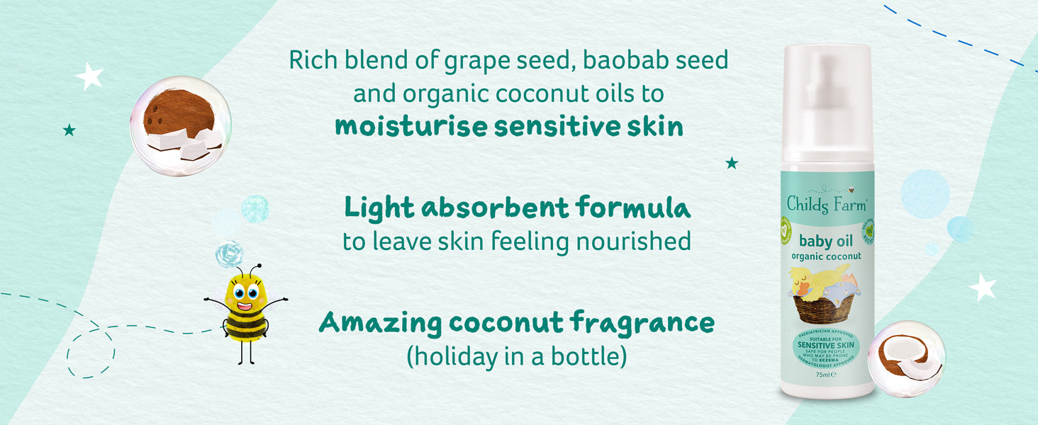 A light and luxurious baby oil containing organic coconut oil. So mild and gentle, it is suitable for newborns & babies even those with sensitive skin and eczema prone skin. Massage all over babys body, hands, face and feet to moisturise and hydrate all skin types. Suitable for newborns and upwards. Dermatologist approved. For sensitive skin and eczema prone skin. Happy skin means happy babies (and parents too).