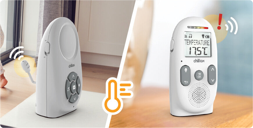 The Chillax CB260 audio baby monitor combines performance and ease of use with a 2-line backlit LCD screen that displays the temperature measured in the baby's room with an accuracy of ±0.5°C. DECT technology ensures clear, interference-free communication. Talk to your baby remotely using the walkie-talkie function, and receive an alert if the battery is low or you lose range.You can approach your baby with complete peace of mind: the reduced feedback between units eliminates any whistling between the two units.