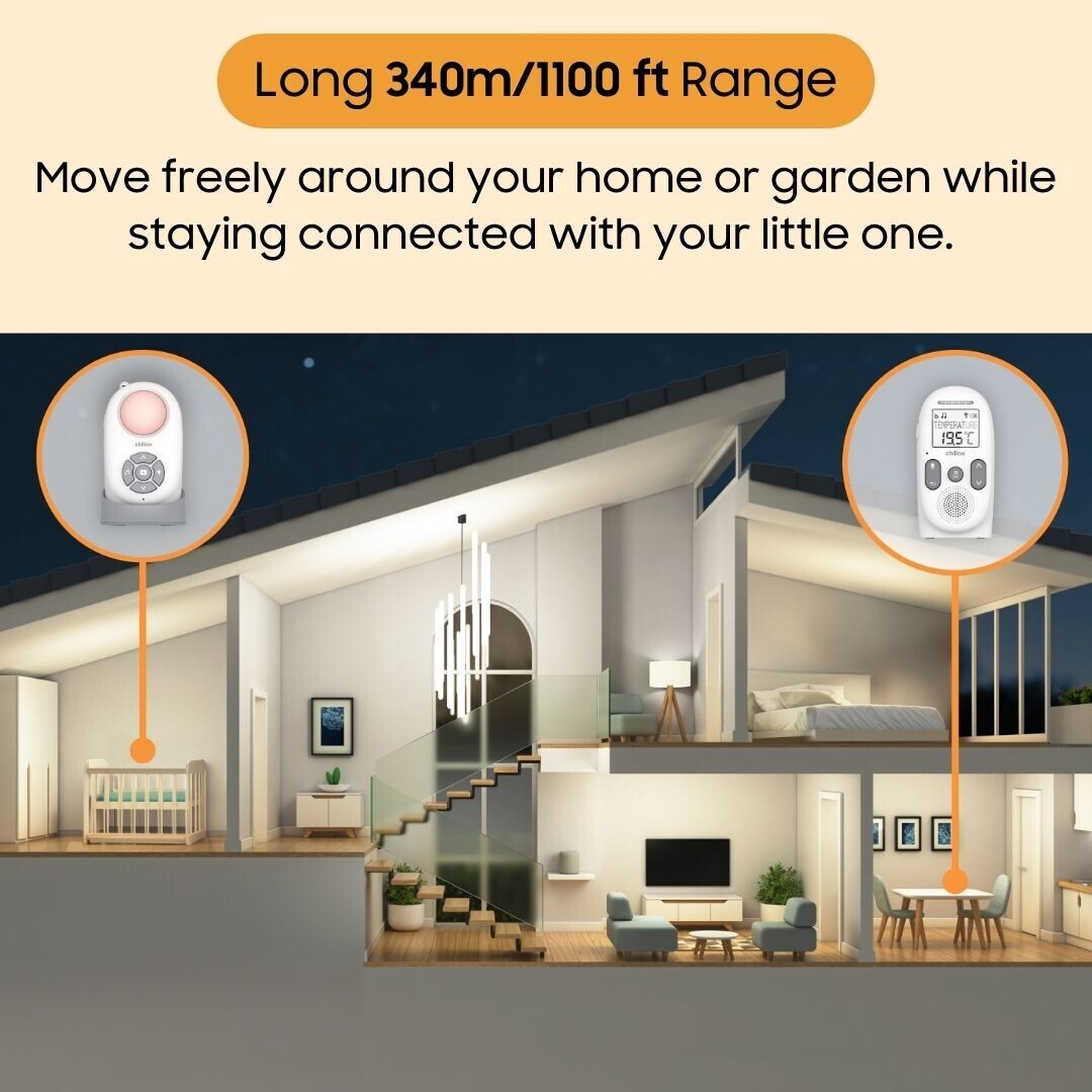 - LONG RANGE AND BATTERY LIFE: The baby monitor has a battery life of 13 hours for the parent unit and 9 hours for the baby unit, with a range of up to 340 m. Receive an alert when the battery is low or out of range. VOX and ECO modes adjust audio transmission to save power and energy.