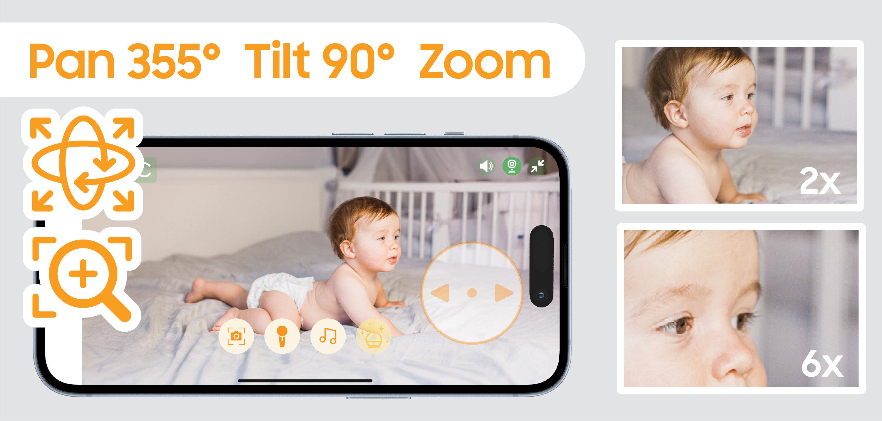 - 360° HIGH-DEFINITION CAMERA: With this baby monitor, the viewing angle can be adjusted horizontally (355°), vertically (90°) and with 2x zoom from the parent unit or 6x zoom via the app. The camera's 2K quality provides a clear image day and night thanks to infrared vision.