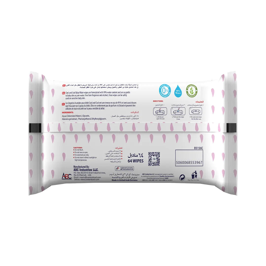 Cool & Cool Aqua Wipes are crafted with the utmost care, ensuring they are 99% water-based and completely alcohol-free, making them perfect for ultra-sensitive skin. These wipes are gentle enough for everyday use, providing a soothing and refreshing experience. The absence of fragrance ensures that the wipes are safe for even the most delicate skin types, including babies.