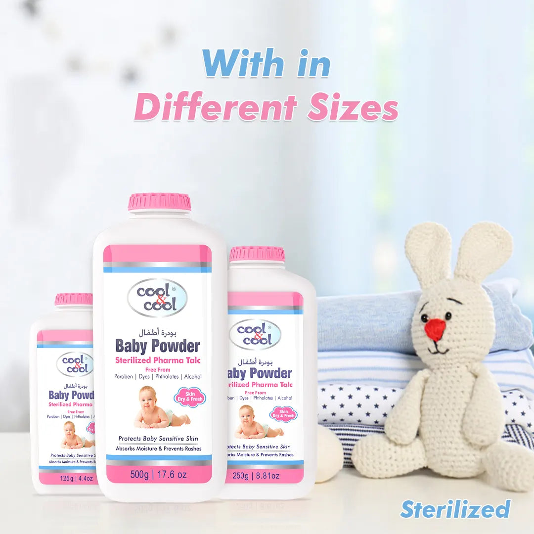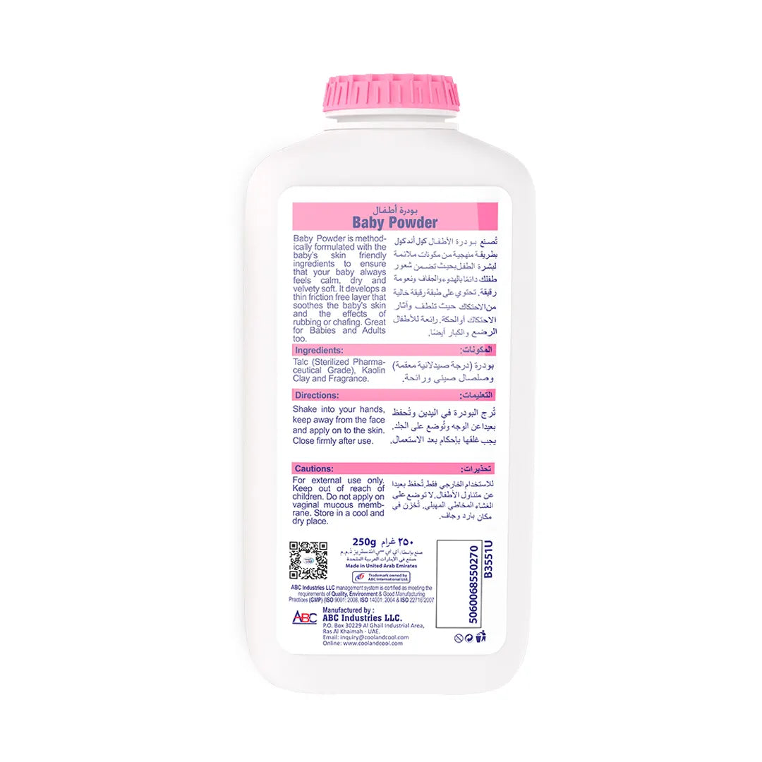Cool and Cool Baby Powder is specially designed for delicate baby skin. Its ultra-absorbent formula absorbs moisture from baby skin and keeps it feeling dry and fresh. The gentle formula prevents diaper rashes and leaves a mild pleasing fragrance. It contains no alcohol parabens, dyes and phthalates and can safely be used on even the most sensitive baby skin.