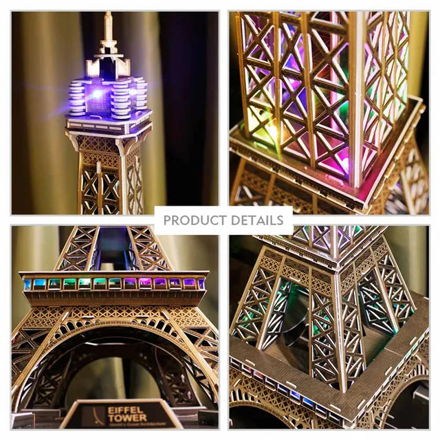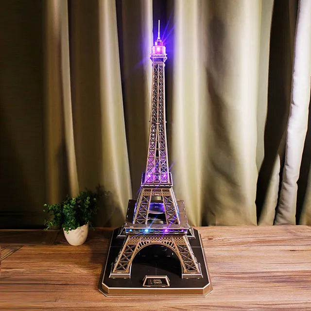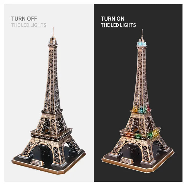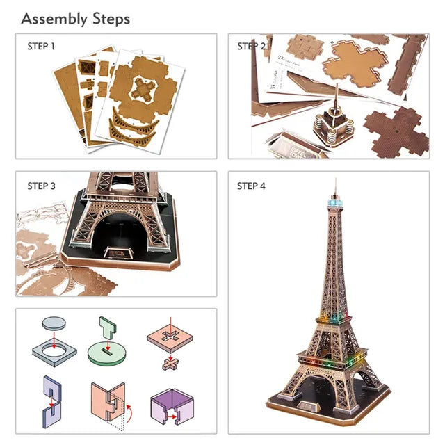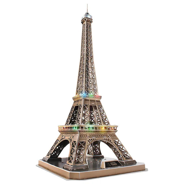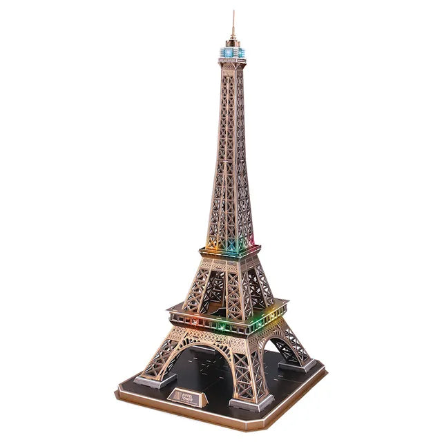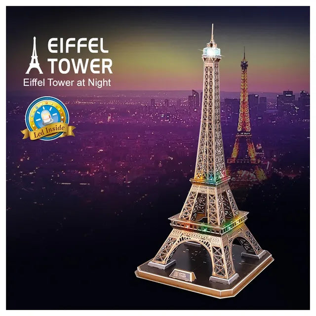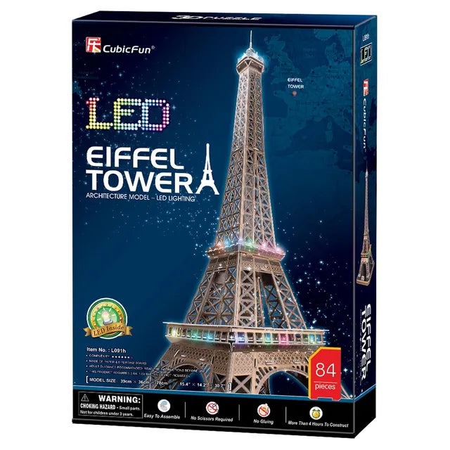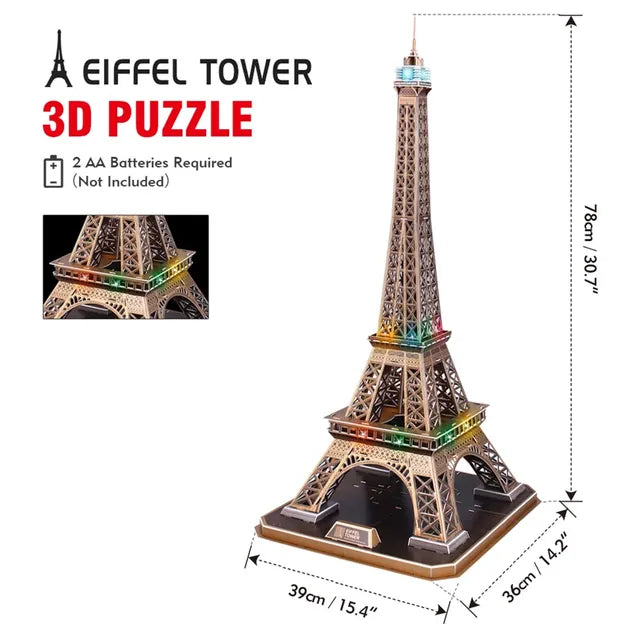 CubicFun 3D Puzzle Eiffel Tower - 84 pieces 3D architecture model puzzle with LED lighting. It requires 2 x AA batteries (not included). The Eiffel Tower is the symbol of Paris and is one of the most recognizable structures in the world. It was built for the International Exhibition of Paris of 1889 commemorating the centenary of the French Revolution., 3D Puzzle Eiffel Tower will be 78 cm tall when completed. Display as an art/decoration/collection. Gift for children/friends. Family Puzzle. Discover history of architecture. Materials used in this model are safe, eco-friendly, non-poisonous paper and EPS foam core.