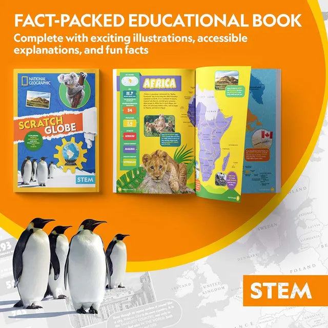 Use the scratch off tool to scratch the continent. A map with geographical details of the countries and animals will reveal underneath. Complete with exciting illustrations, accessible explanations and fun facts.