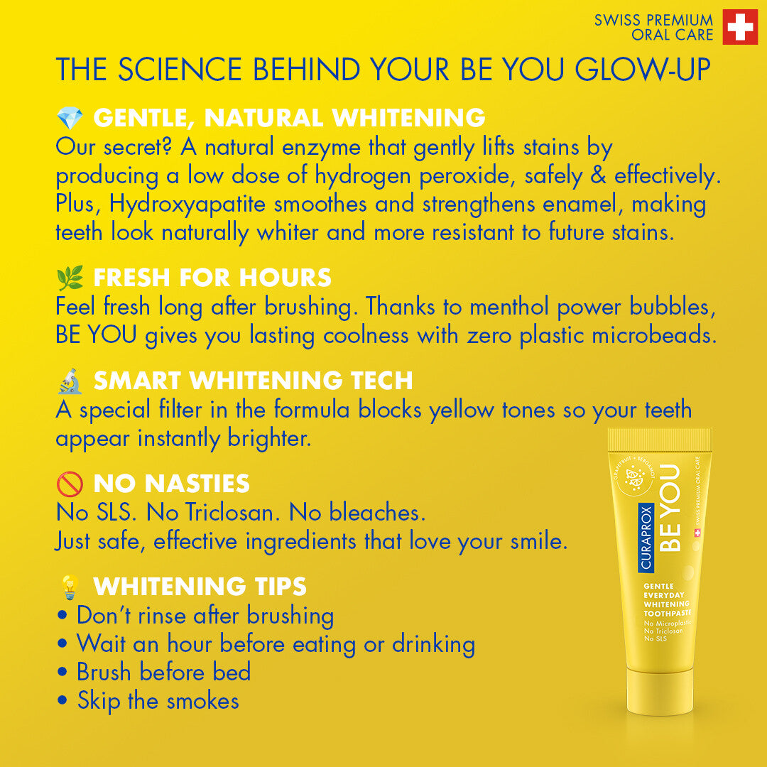 Be You Toothpaste is a fun and refreshing toothpaste range designed to offer a unique flavor experience while effectively caring for your oral health. Each variant is formulated with natural ingredients and is free from SLS, triclosan, microplastics, and is vegan—making it gentle on teeth and gums. The toothpaste's gentle yet powerful formula cleans your teeth, protects your gums, and leaves your mouth feeling fresh for hours.