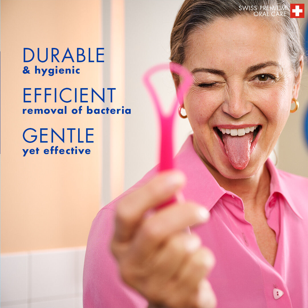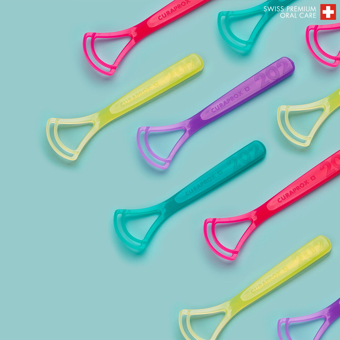 The Curaprox CTC 202 tongue cleaner features a double-blade design that gently yet effectively removes bacterial coating from the tongue's surface—one of the most common causes of bad breath. Its compact minigrip handle ensures precise control, making it easy to use and comfortable even for sensitive users.
